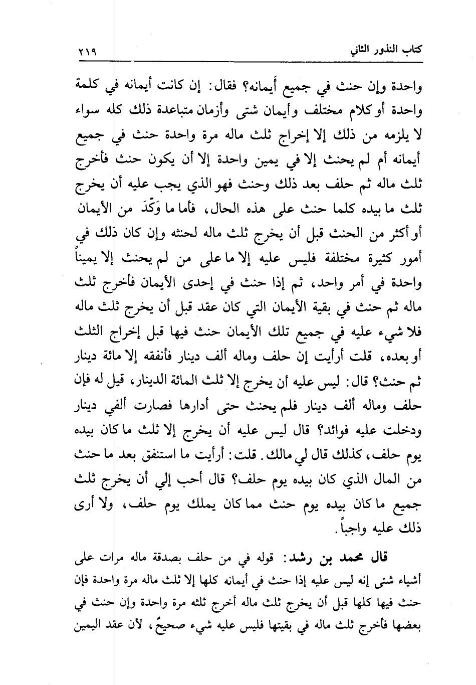واحدة وإن حنث في جميع أيمانه؟ فقال: إن كانت أيمانه في كلمة واحدة أو كلام مختلف وأيمان شتى وأزمان متباعدة ذلك كله سواء لا يلزمه من ذلك إلا إخراج ثلث ماله مرة واحدة حنث في جميع أيمانه أم لم يحنث إلا في يمين واحدة إلا أن يكون حنث فأخرج ثلث ماله ثم حلف بعد ذلك وحنث فهو الذي يجب عليه أن يخرج ثلث ما بيده كلما حنث على هذه الحال، فأما ما وكد من الأيمان أو أكثر من الحنث قبل أن يخرج ثلث ماله لحنثه وإن كان ذلك في أمور كثيرة مختلفة فليس عليه إلا ما على من لم يحنث إلا يمينا واحدة في أمر واحد، ثم إذا حنث في إحدى الأيمان فأخر ثلث ماله ثم حنث في بقية الأيمان التي كان عقد قبل أن يخرج ثلث ماله فلا شيء عليه في جميع تلك الأيمان حنث فيها قبل إخراج الثلث أو بعده، قلت: أرأيت إن حلف وماله ألف دينار فأنفقه إلا مائة دينار ثم حنث؟ قال: ليس عليه أن يخرج إلا ثلث المائه الدينار، قيل له: فإن حلف وماله ألف دينار فلم يحنث حتى أدارها فصارت ألفي دينار ودخلت عليه فوائد؟ قال: ليس عليه أن يخرج إلا ثلث ما كان بيده يوم حلف، كذلك قال لي مالك. قلت: أرأيت ما استنفق بعد ما حنث من المال الذي كان بيده يوم حلف؟ قال: أحب إلي أن يخرج ثلث جميع ما كان بيده يوم حنث مما كان يملك يوم حلف، ولا أرى ذلك عليه واجبا.
