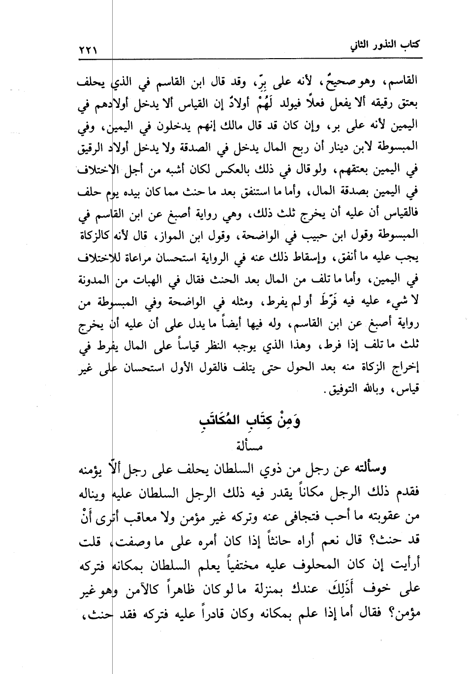 القاسم، وهو صحيح؛ لأنه على بر، وقد قال ابن القاسم في الذي يحلف بعتق رقيقه ألا يفعل فعلا فيولد لهم أولاد إن القياس ألا يدخل أولادهم في اليمين لأنه علي بر، وإن كان قد قال مالك إنهم يدخلون في اليمين، وفي المبسوطة لابن دينار أن ربح المال يدخل في الصدقة ولا يدخل أولاد الرقيق في اليمين بعتقهم، ولو قال في ذلك بالعكس لكان أشبه من أجل الاختلاف في اليمين بصدقة المال، وأما ما استنفق بعد ما حنث مما كان بيده يوم حلف فالقياس أن عليه أن يخرج ثلث ذلك، وهي رواية أصبغ عن ابن القاسم في المبسوطة وقول ابن حبيب في الواضحة، وقول ابن المواز، قال: لأنه كالزكاة يجب عليه ما أنفق، وإسقاط ذلك عنه في الرواية استحسان مراعاة للاختلاف في اليمين، وأما ما تلف من المال بعد الحنث فقال في الهبات من المدونة لا شيء عليه فيه فرط أو لم يفرط، ومثله في الواضحة وفي المبسوطة من رواية أصبغ عن ابن القاسم، وله فيها أيضا ما يدل على أن عليه أن يخرج ثلث ما تلف إذا فرط، وهذا الذي يوجبه النظر قياسا على المال يفرط في إخراج الزكاة منه بعد الحول حتى يتلف فالقول الأول استحسان على غير قياس، وبالله التوفيق.