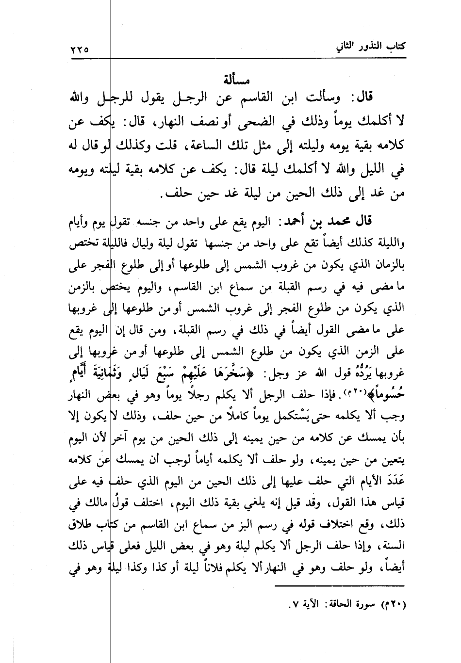 مسألة قال: وسألت ابن القاسم عن الرجل يقول للرجل: والله لا أكلمك يوما وذلك في الضحى أو نصف النهار، قال: يكف عن كلامه بقية يومه وليلته إلى مثل تلك الساعة، قلت: وكذلك لو قال له في الليل والله لا أكلمك ليلة قال: يكف عن كلامه بقية ليلته ويومه من غد إلى ذلك الحين من ليلة غد حين حلف.