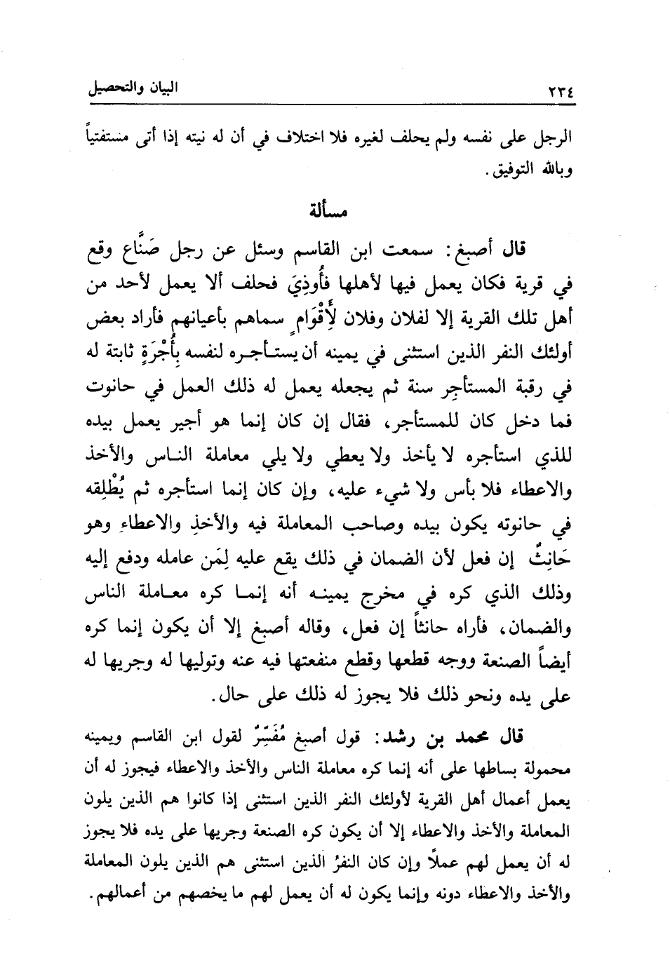 قال محمد بن رشد: قول أصبغ مفسر لقول ابن القاسم ويمينه محمولة بساطها على أنه إنما كره معاملة الناس والأخذ والإعطاء فيجوز له أن يعمل أعمال أهل القرية لأولئك النفر الذين استثنى إذا كانوا هم الذين يلون المعاملة والأخذ والإعطاء إلا أن يكون كره الصنعة وجريها على يده فلا يجوز له أن يعمل لهم عملا وإن كان النفر الذين استثنى هم الذين يلون المعاملة والأخذ والإعطاء دونه وإنما يكون له أن يعمل لهم ما يخصهم من أعمالهم.