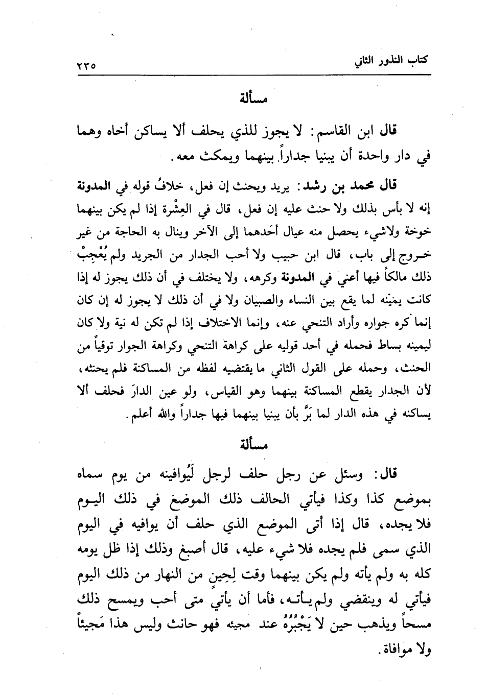 مسألة قال ابن القاسم: لا يجوز للذي يحلف ألا يساكن أخاه وهما في دار واحدة أن يبنيا جدارا بينهما ويمكث معه.