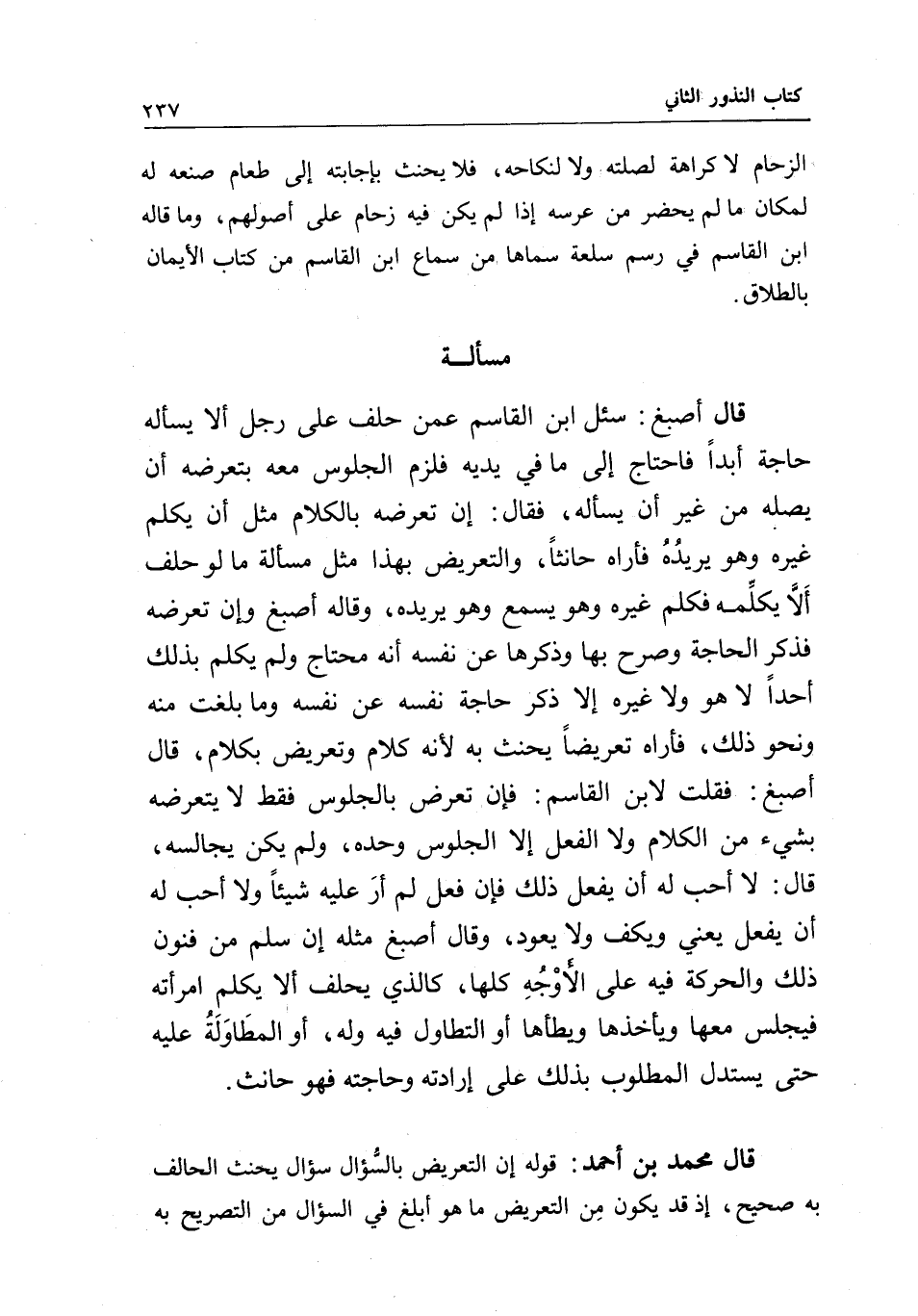 قال محمد بن أحمد: قوله إن التعريض بالسؤال سؤال يحنث الحالف به صحيح؛ إذ قد يكون من التعريض ما هو أبلغ في السؤال من التصريح به