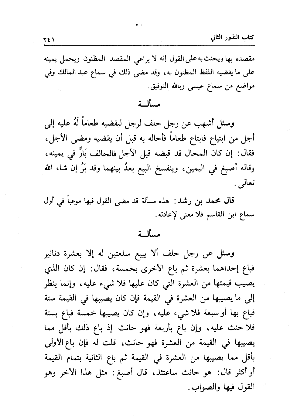 قال محمد بن رشد: هذه مسألة قد مضى القول فيها موعبا في أول سماع ابن القاسم فلا معنى لإعادته.