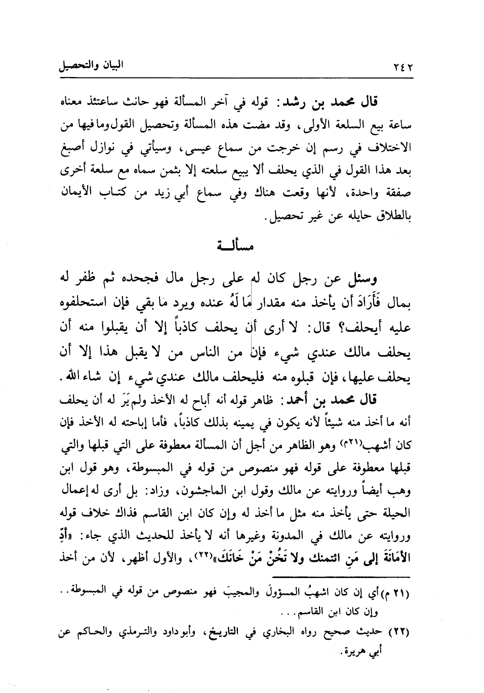 مسألة وسئل عن رجل كان له على رجل مال فجحده ثم ظفر له بمال فأراد أن يأخذ منه مقدار ما له عنده ويرد ما بقي فإن استحلفوه عليه أيحلف؟ قال: لا أرى أن يحلف كاذبا إلا أن يقبلوا منه أن يحلف ما لك عندي شيء فإن من الناس من لا يقبل هذا إلا أن يحلف عليها، فإن قبلوه منه فليحلف ما لك عندي شيء إن شاء الله. قال محمد بن أحمد: ظاهر قوله أنه أباح له الأخذ ولم ير له أن يحلف أنه ما أخذ منه شيئا لأنه يكون في يمينه بذلك كاذبا، فأما إباحته له الأخذ فإن كان أشهب وهو الظاهر من أجل أن المسألة معطوفة على التي قبلها والتي قبلها معطوفة على قوله فهو منصوص من قوله في المبسوطة، وهو قول ابن وهب أيضا وروايته عن مالك وقول ابن الماجشون، وزاد: بل أرى له إعمال الحيلة حتى يأخذ منه مثل ما أخذ له وإن كان ابن القاسم فذاك خلاف قوله وروايته عن مالك في المدونة وغيرها أنه لا يأخذ للحديث الذي جاء: «أد الأمانة إلى من ائتمنك ولا تخن من خانك» ، والأول أظهر؛ لأن من أخذ