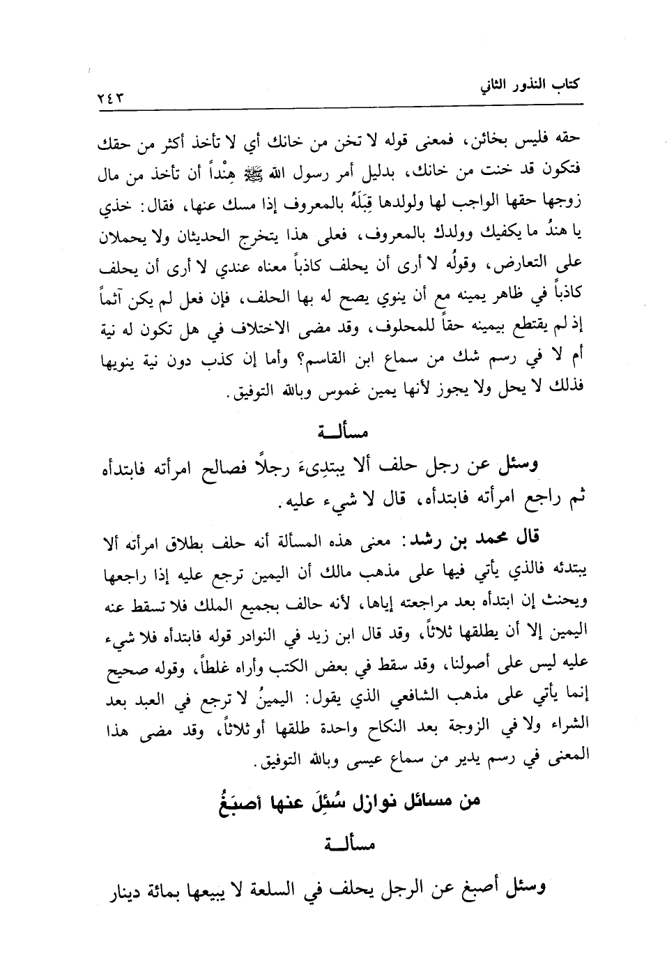 من مسائل نوازل سئل عنها أصبغ مسألة وسئل أصبغ عن الرجل يحلف في السلعة لا يبيعها بمائة دينار