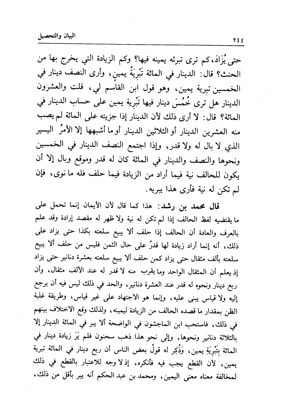 قال محمد بن رشد: هذا كما قال: لأن الأيمان إنما تحمل على ما يقتضيه لفظ الحالف إذا لم يكن له نية ولا ظهر له مقصد إرادة وقد علم بالعرف والعادة أن الحالف إذا حلف ألا يبيع سلعته بكذا حتى يزاد على ذلك، أنه إنما أراد زيادة لها قدر على حال الثمن فليس من حلف ألا يبيع سلعته بألف مثقال حتى يزاد كمن حلف ألا يبيع سلعته بعشرة دنانير حتى يزاد إذ يعلم أن المثقال الواحد وما يقرب منه لا قدر له عند الألف مثقال، وأن ربع دينار ونحوه له قدر عند العشرة دنانير، والحد في ذلك ليس فيه أن يرجع إليه ولا قياس يبنى عليه، وإنما هو الاجتهاد على غير قياس، وطريقة غلبة الظن بمقدار ما قصده الحالف من الزيادة ليمينه، ولذلك وقع الاختلاف بينهم في ذلك، فاستحب ابن الماجشون في الواضحة ألا يبر في المائة الدينار إلا بالثلاثة دنانير ونحوها، وإلى نحو هذا ذهب سحنون فلم ير زيادة دينار في المائة بتبرية يمين، وذكر له قول بعض الناس أن ربع دينار في المائة تبرية يمين؛ لأن القطع يجب فيه فأنكره؛ إذ لا وجه للاعتبار بالقطع في ذلك لمخالفة معناه معنى اليمين، ومحمد بن عبد الحكم أنه يبر بأقل من ذلك،