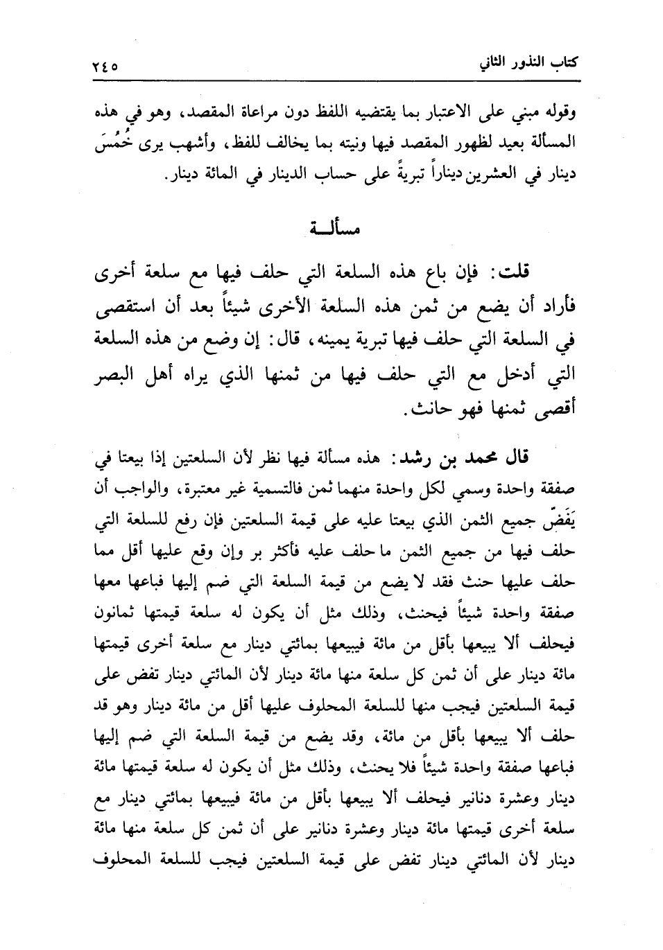 قال محمد بن رشد: هذه مسألة فيها نظر لأن السلعتين إذا بيعتا في صفقة واحدة وسمي لكل واحدة منهما ثمن فالتسمية غير معتبرة، والواجب أن يفض جميع الثمن الذي بيعتا عليه على قيمة السلعتين فإن رفع للسلعة التي حلف فيها من جميع الثمن ما حلف عليه فأكثر بر وإن وقع عليها أقل مما حلف عليها حنث فقد لا يضع من قيمة السلعة التي ضم إليها فباعها معها صفقة واحدة شيئا فيحنث، وذلك مثل أن يكون له سلعة قيمتها ثمانون فيحلف ألا يبيعها بأقل من مائة فيبيعها بمائتي دينار مع سلعة أخرى قيمتها مائة دينار على أن ثمن كل سلعة منها مائة دينار لأن المائتي دينار تفض على قيمة السلعتين فيجب منها للسلعة المحلوف عليها أقل من مائة دينار وهو قد حلف ألا يبيعها بأقل من مائة، وقد يضع من قيمة السلعة التي ضم إليها فباعها صفقة واحدة شيئا فلا يحنث، وذلك مثل أن يكون له سلعة قيمتها مائة دينار وعشرة دنانير فيحلف ألا يبيعها بأقل من مائة فيبيعها بمائتي دينار مع سلعة أخرى قيمتها مائة دينار وعشرة دنانير على أن ثمن كل سلعة منها مائة دينار لأن المائتي دينار تفض على قيمة السلعتين فيجب للسلعة المحلوف