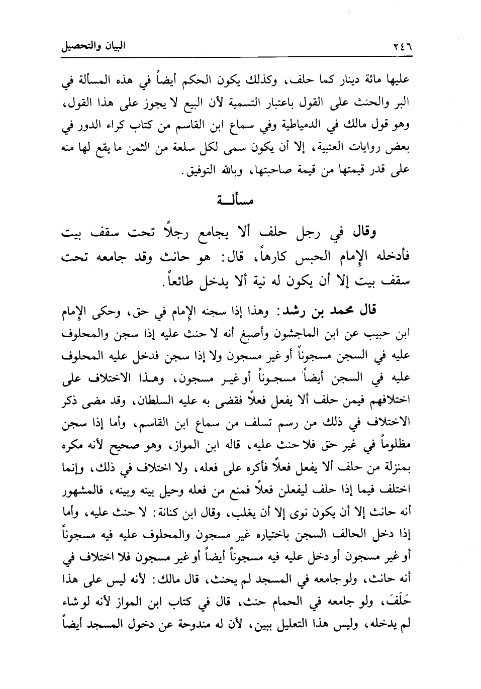 قال محمد بن رشد: وهذا إذا سجنه الإمام في حق، وحكى الإمام ابن حبيب عن ابن الماجشون وأصبغ أنه لا حنث عليه إذا سجن والمحلوف عليه في السجن مسجونا أو غير مسجون ولا إذا سجن فدخل عليه المحلوف عليه في السجن أيضا مسجونا أو غير مسجون، وهذا الاختلاف على اختلافهم فيمن حلف ألا يفعل فعلا فقضى به عليه السلطان، وقد مضى ذكر الاختلاف في ذلك من رسم تسلف من سماع ابن القاسم، وأما إذا سجن مظلوما في غير حق فلا حنث عليه، قاله ابن المواز، وهو صحيح لأنه مكره بمنزلة من حلف ألا يفعل فعلا فأكره على فعله، ولا اختلاف في ذلك، وإنما اختلف فيما إذا حلف ليفعلن فعلا فمنع من فعله وحيل بينه وبينه، فالمشهور أنه حانث إلا أن يكون نوى إلا أن يغلب، وقال ابن كنانة: لا حنث عليه، وأما إذا دخل الحالف السجن باختياره غير مسجون والمحلوف عليه فيه مسجونا أو غير مسجون أو دخل عليه فيه مسجونا أيضا أو غير مسجون فلا اختلاف في أنه حانث، ولو جامعه في المسجد لم يحنث، قال مالك: لأنه ليس على هذا حلف، ولو جامعه في الحمام حنث، قال في كتاب ابن المواز: لأنه لو شاء لم يدخله، وليس هذا التعليل ببين؛ لأن له مندوحة عن دخول المسجد أيضا