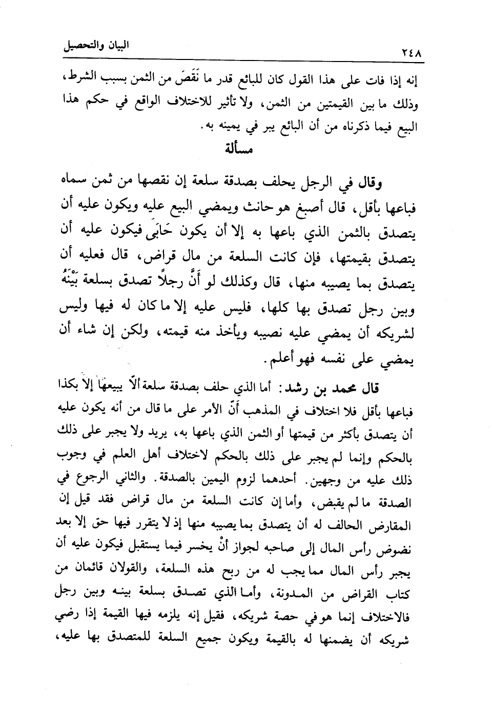 قال محمد بن رشد: أما الذي حلف بصدقة سلعة ألا يبيعها إلا بكذا فباعها بأقل فلا اختلاف في المذهب أن الأمر على ما قال من أنه يكون عليه أن يتصدق بأكثر من قيمتها أو الثمن الذي باعها به، يريد ولا يجبر على ذلك بالحكم وإنما لم يجبر على ذلك بالحكم لاختلاف أهل العلم في وجوب ذلك عليه من وجهين. أحدهما لزوم اليمين بالصدقة. والثاني الرجوع في الصدقة ما لم يقبض، وأما إن كانت السلعة من مال قراض فقد قيل: إن المقارض الحالف له أن يتصدق بما يصيبه منها إذ لا يتقرر فيها حق إلا بعد نضوض رأس المال إلى صاحبه لجواز أن يخسر فيما يستقبل فيكون عليه أن يجبر رأس المال مما يجب له من ربح هذه السلعة، والقولان قائمان من كتاب القراض من المدونة، وأما الذي تصدق بسلعة بينه وبين رجل فالاختلاف إنما هو في حصة شريكه، فقيل: إنه يلزمه فيها القيمة إذا رضي شريكه أن يضمنها له بالقيمة ويكون جميع السلعة للمتصدق بها عليه،