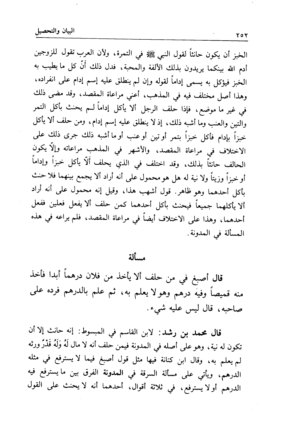 قال محمد بن رشد: لابن القاسم في المبسوط: إنه حانث إلا أن تكون له نية، وهو على أصله في المدونة فيمن حلف أنه لا مال له وله قدر ورثه لم يعلم به، وقال ابن كنانة فيها مثل قول أصبغ فيما لا يسترفع في مثله الدرهم، ويأتي على مسألة السرقة في المدونة الفرق بين ما يسترفع فيه الدرهم أو لا يسترفع، في ثلاثة أقوال، أحدهما أنه لا يحنث على القول