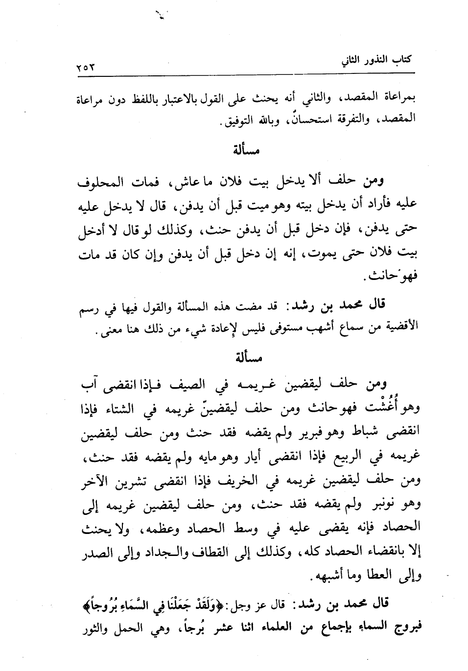 مسألة ومن حلف ليقضين غريمه في الصيف فإذا انقضى آب وهو أُغُشْت فهو حانث ومن حلف ليقضين غريمه في الشتاء فإذا انقضى شباط وهو فبراير ولم يقضه فقد حنث، ومن حلف ليقضين غريمه في الربيع فإذا انقضى أيار وهو مايه ولم يقضه فقد حنث، ومن حلف ليقضين غريمه في الخريف فإذا انقضى تشرين الآخر وهو نونبر ولم يقضه فقد حنث، ومن حلف ليقضين غريمه إلى الحصاد فإنه يقضى عليه في وسط الحصاد وعظمه، ولا يحنث إلا بانقضاء الحصاد كله، وكذلك إلى القطاف والجداد وإلى الصدر وإلى العطا وما أشبهه.
