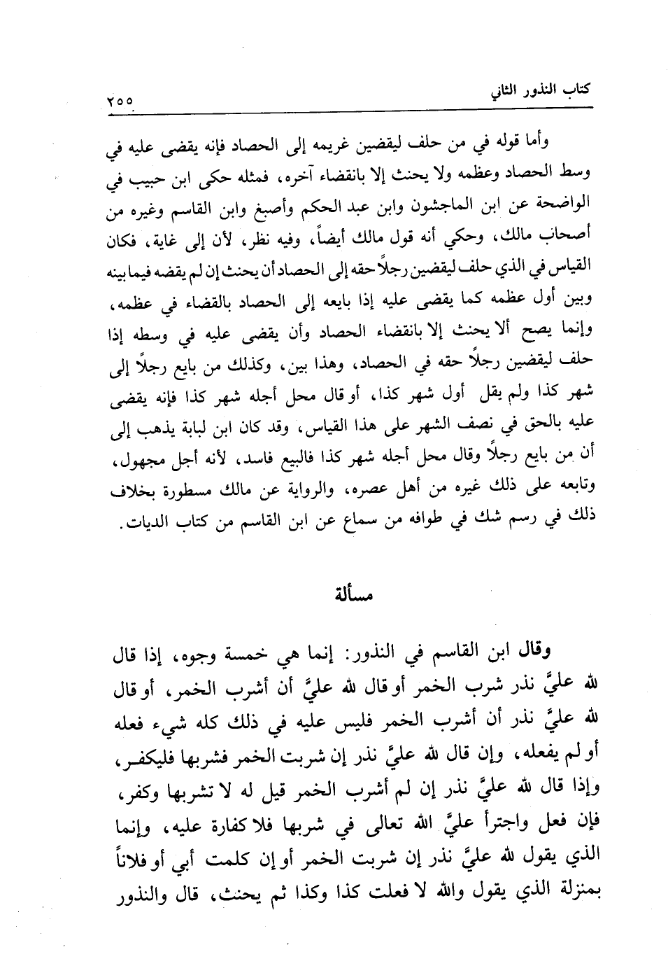 مسألة وقال ابن القاسم في النذور: إنما هي خمسة وجوه، إذا قال: لله علي نذر شرب الخمر أو قال: لله علي أن أشرب الخمر، أو قال: لله علي نذر أن أشرب الخمر فليس عليه في ذلك كله شيء فعله أو لم يفعله، وإن قال: لله علي نذر إن شربت الخمر فشربها فليكفر، وإذا قال: لله علي نذر إن لم أشرب الخمر قيل له: لا تشربها وكفر، فإن فعل واجترأ علي الله تعالى في شربها فلا كفارة عليه، وإنما الذي يقول لله علي نذر إن شربت الخمر أو إن كلمت أبي أو فلانا بمنزلة الذي يقول: والله لا فعلت كذا وكذا ثم يحنث، قال: والنذور