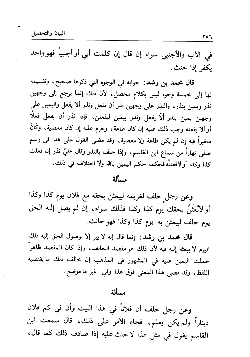 قال محمد بن رشد: جوابه في الوجوه التي ذكرها صحيح، وتقسيمه لها إلى خمسة وجوه ليس بكلام محصل؛ لأن ذلك إنما يرجع إلى وجهين نذر ويمين بنذر، والنذر على وجهين نذر أن يفعل ونذر ألا يفعل واليمين على وجهين يمين بنذر ألا يفعل ونذر بيمين ليفعلن، فإذا نذر أن يفعل فعلا أو ألا يفعله وجب ذلك عليه إن كان طاعة، وحرم عليه إن كان معصية، وكان مخيرا فيه إن لم يكن طاعة ولا معصية، وقد مضى القول على هذا في رسم صلى نهارا من سماع ابن القاسم، وإذا حلف بالنذر وقال: علي نذر إن فعلت كذا وكذا أو لأفعلنه فحكمه حكم اليمين بالله ولا اختلاف في ذلك.