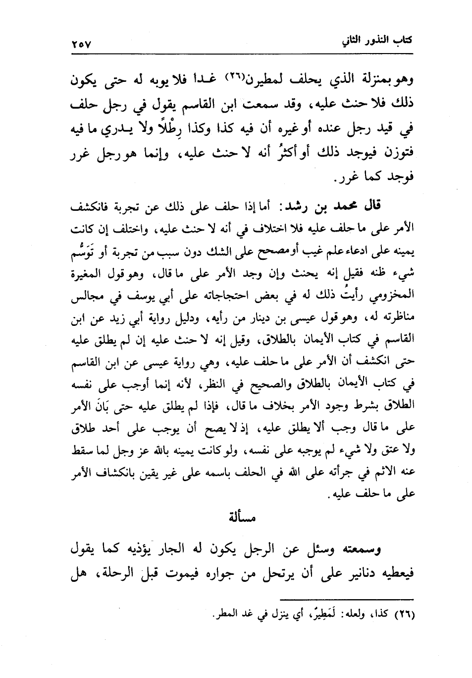 وهو بمنزلة الذي يحلف لمطيرن غدا فلا يوبه له حتى يكون ذلك فلا حنث عليه، وقد سمعت ابن القاسم يقول في رجل حلف في قيد رجل عنده أو غيره أن فيه كذا وكذا رطلا، ولا يدري ما فيه فتوزن فيوجد ذلك أو أكثر أنه لا حنث عليه، وإنما هو رجل غرر فوجد كما غرر.