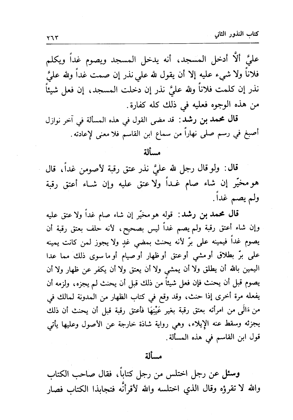 علي ألا أدخل المسجد، أنه يدخل المسجد ويصوم غدا ويكلم فلانا ولا شيء عليه إلا أن يقول: لله علي نذر إن صمت غدا، ولله علي نذر إن كلمت فلانا، ولله علي نذر إن دخلت المسجد، إن فعل شيئا من هذه الوجوه فعليه في ذلك كله كفارة.