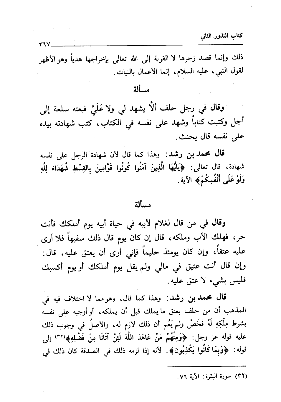 قال محمد بن رشد: وهذا كما قال لأن شهادة الرجل على نفسه شهادة، قال تعالى: {يَا أَيُّهَا الَّذِينَ آمَنُوا كُونُوا قَوَّامِينَ بِالْقِسْطِ شُهَدَاءَ لِلَّهِ وَلَوْ عَلَى أَنْفُسِكُمْ} [النساء: 135] الآية.