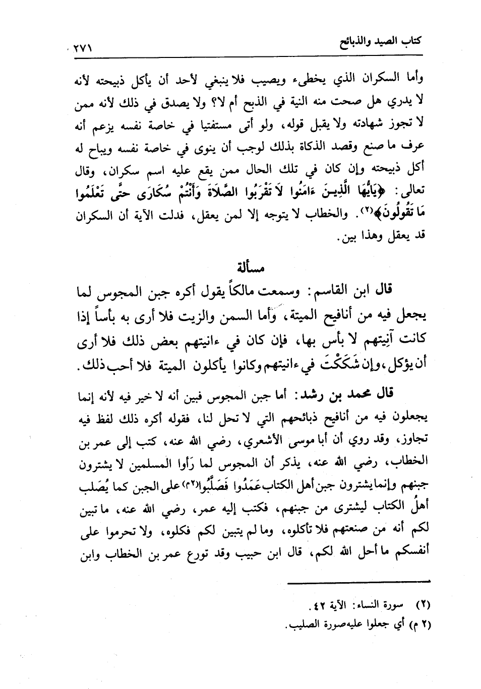 وأما السكران الذي يخطئ ويصيب فلا ينبغي لأحد أن يأكل ذبيحته لأنه لا يدري هل صحت منه النية في الذبح أم لا؛ ولا يصدق في ذلك لأنه ممن لا تجوز شهادته ولا يقبل قوله، ولو أتى مستفتيا في خاصة نفسه يزعم أنه عرف ما صنع وقصد الذكاة بذلك لوجب أن ينوي في خاصة نفسه ويباح له أكل ذبيحته وإن كان في تلك الحال ممن يقع عليه اسم سكران، وقال تعالى: {يَا أَيُّهَا الَّذِينَ آمَنُوا لا تَقْرَبُوا الصَّلاةَ وَأَنْتُمْ سُكَارَى حَتَّى تَعْلَمُوا مَا تَقُولُونَ} [النساء: 43] . والخطاب لا يتوجه إلا لمن يعقل، فدلت الآية أن السكران قد يعقل وهذا بين.