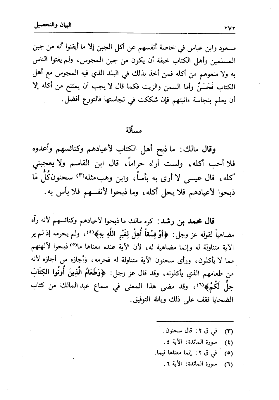 قال محمد بن رشد: كره مالك ما ذبحوا لأعيادهم وكنائسهم لأنه رآه مضاهيا لقوله عز وجل: {أَوْ فِسْقًا أُهِلَّ لِغَيْرِ اللَّهِ بِهِ} [الأنعام: 145] ، ولم يحرمه إذ لم ير الآية متناولة له وإنما مضاهية له؛ لأن الآية عنده معناها ما ذبحوا لآلهتهم مما لا يأكلون، ورأى سحنون الآية متناولة له فحرمه، وأجازه من أجازه لأنه من طعامهم الذي يأكلونه، وقد قال عز وجل: {وَطَعَامُ الَّذِينَ أُوتُوا الْكِتَابَ حِلٌّ لَكُمْ} [المائدة: 5] ، وقد مضى هذا المعنى في سماع عبد المالك من كتاب الضحايا فقف على ذلك وبالله التوفيق.