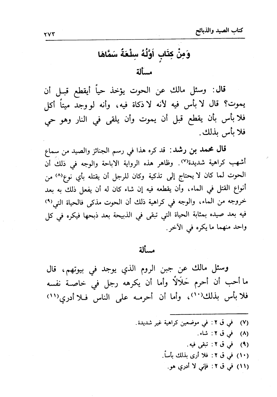 ومن كتاب أوله سلعة سماها مسألة قال: وسئل مالك عن الحوت يؤخذ حيا أيقطع قبل أن يموت؟ قال: لا بأس فيه لأنه لا ذكاة فيه، وأنه لو وجد ميتا أكل، فلا بأس بأن يقطع قبل أن يموت، وأن يلقى في النار وهو حي فلا بأس بذلك.