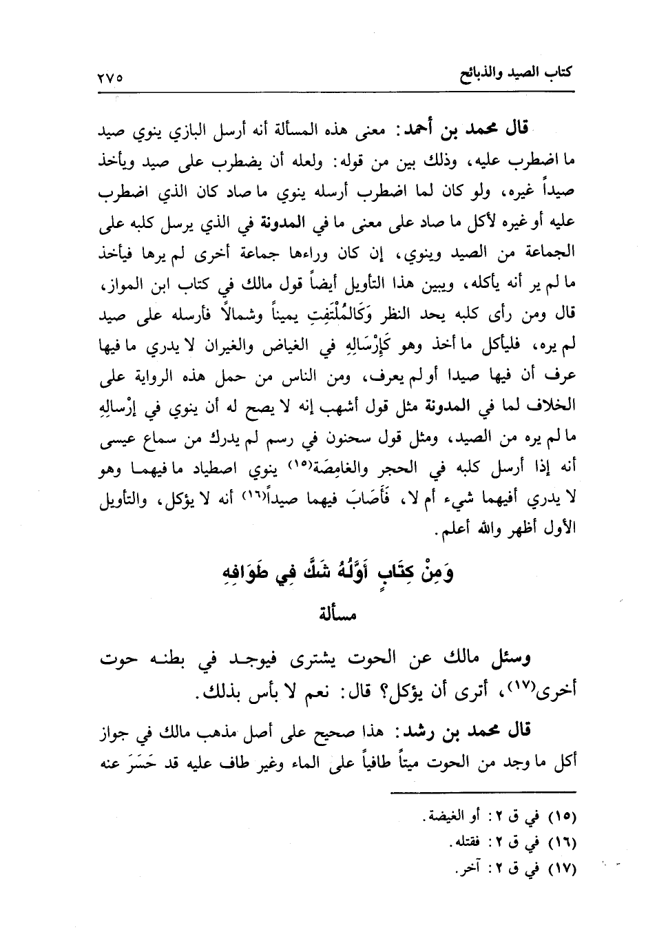 ومن كتاب أوله شك في طوافه مسألة وسئل مالك عن الحوت يشترى فيوجد في بطنه حوت أخرى، أترى أن يؤكل؟ قال: نعم، لا بأس بذلك.