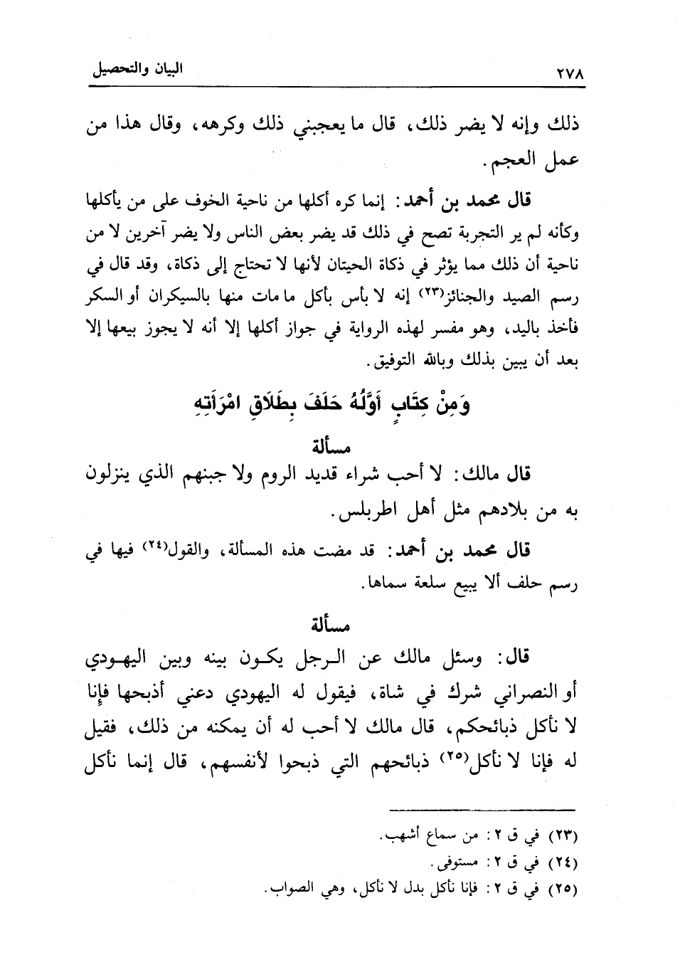 مسألة قال: وسئل مالك عن الرجل يكون بينه وبين اليهودي أو النصراني شرك في شاة، فيقول له اليهودي: دعني أذبحها فإنا لا نأكل ذبائحكم، قال مالك: لا أحب له أن يمكنه من ذلك، فقيل له: فإنا لا نأكل ذبائحهم التي ذبحوا لأنفسهم، قال: إنما نأكل