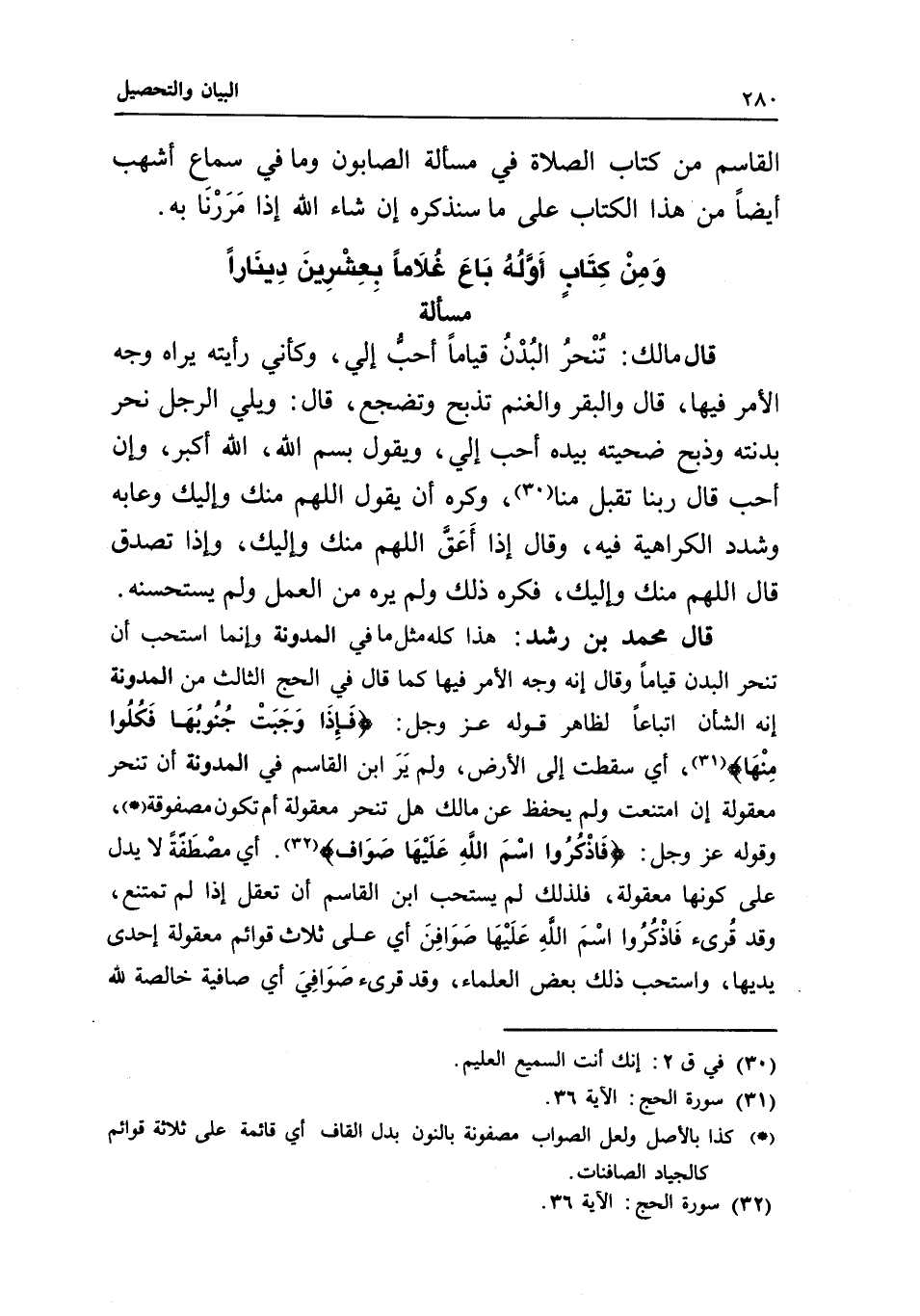 قال محمد بن رشد: هذا كله مثل ما في المدونة وإنما استحب أن تنحر البدن قياما، وقال: إنه وجه الأمر فيها كما قال في الحج الثالث من المدونة إنه الشأن اتباعا لظاهر قوله عز وجل: {فَإِذَا وَجَبَتْ جُنُوبُهَا فَكُلُوا مِنْهَا} [الحج: 36] ، أي سقطت إلى الأرض، ولم ير ابن القاسم في المدونة أن تنحر معقولة إن امتنعت ولم يحفظ عن مالك هل تنحر معقولة أم تكون مصفوقة، وقوله عز وجل: {فَاذْكُرُوا اسْمَ اللَّهِ عَلَيْهَا صَوَافَّ} [الحج: 36] . أي مصطفة لا يدل على كونها معقولة، فلذلك لم يستحب ابن القاسم أن تعقل إذا لم تمتنع، وقد قرئ فاذكروا اسم الله عليها صوافن أي على ثلاث قوائم معقولة إحدى يديها، واستحب ذلك بعض العلماء، وقد قرئ صوافي أي صافية خالصة لله