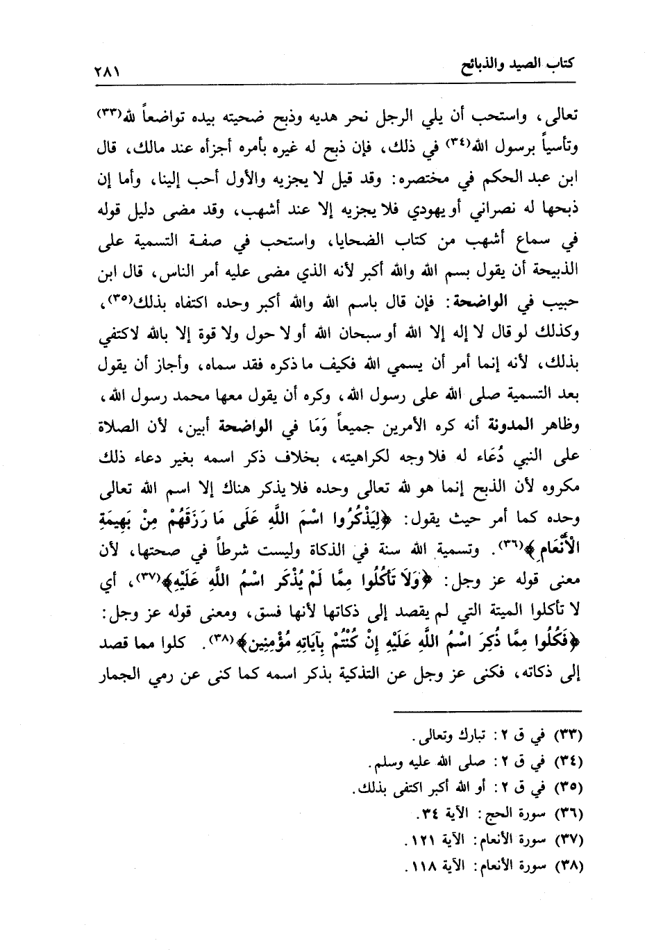وأجاز أن يقول بعد التسمية صلى الله على رسول الله، وكره أن يقول معها محمد رسول الله، وظاهر المدونة أنه كره الأمرين جميعا وما في الواضحة أبين؛ لأن الصلاة على النبي دعاء له فلا وجه لكراهيته، بخلاف ذكر اسمه بغير دعاء ذلك مكروه؛ لأن الذبح إنما هو لله تعالى وحده فلا يذكر هناك إلا اسم الله تعالى وحده كما أمر حيث يقول: {لِيَذْكُرُوا اسْمَ اللَّهِ عَلَى مَا رَزَقَهُمْ مِنْ بَهِيمَةِ الأَنْعَامِ} [الحج: 34] . وتسمية الله سنة في الذكاة وليست شرطا في صحتها؛ لأن معنى قوله عز وجل: {وَلا تَأْكُلُوا مِمَّا لَمْ يُذْكَرِ اسْمُ اللَّهِ عَلَيْهِ} [الأنعام: 121] ، أي لا تأكلوا الميتة التي لم يقصد إلى ذكاتها لأنها فسق، ومعنى قوله عز وجل: {فَكُلُوا مِمَّا ذُكِرَ اسْمُ اللَّهِ عَلَيْهِ إِنْ كُنْتُمْ بِآيَاتِهِ مُؤْمِنِينَ} [الأنعام: 118] . كلوا مما قصد إلى ذكاته، فكنى عز وجل عن التذكية بذكر اسمه كما كنى عن رمي الجمار