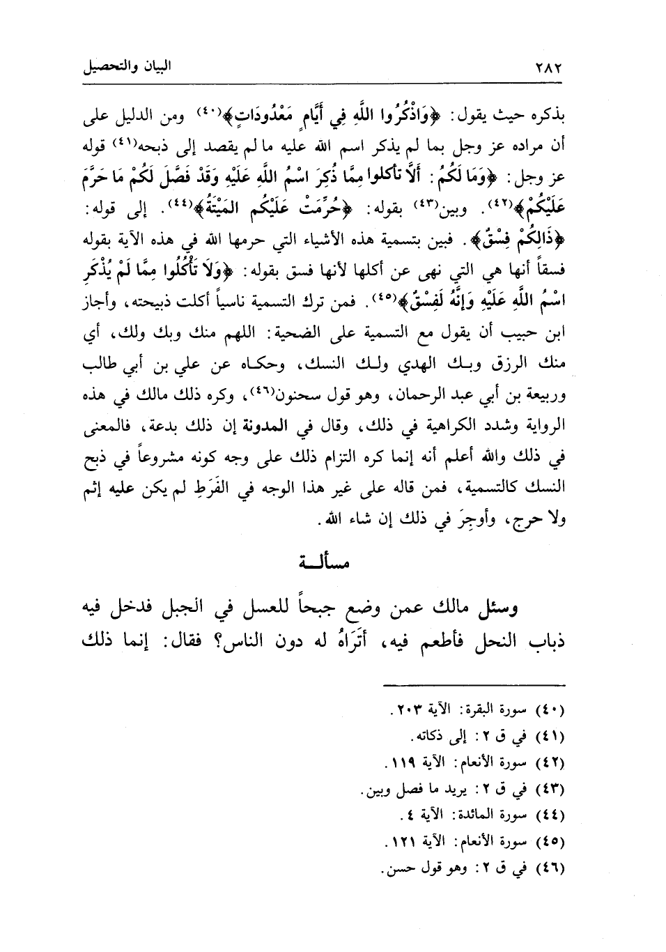 بذكره حيث يقول: {وَاذْكُرُوا اللَّهَ فِي أَيَّامٍ مَعْدُودَاتٍ} [البقرة: 203] ومن الدليل على أن مراده عز وجل بما لم يذكر اسم الله عليه ما لم يقصد إلى ذبحه قوله عز وجل: {وَمَا لَكُمْ أَلا تَأْكُلُوا مِمَّا ذُكِرَ اسْمُ اللَّهِ عَلَيْهِ وَقَدْ فَصَّلَ لَكُمْ مَا حَرَّمَ عَلَيْكُمْ} [الأنعام: 119] . وبين بقوله: {حُرِّمَتْ عَلَيْكُمُ الْمَيْتَةُ} [المائدة: 3] . إلى قوله: {ذَلِكُمْ فِسْقٌ} [المائدة: 3] . فبين بتسمية هذه الأشياء التي حرمها الله في هذه الآية بقوله فسقا أنها هي التي نهى عن أكلها لأنها فسق بقوله: {وَلا تَأْكُلُوا مِمَّا لَمْ يُذْكَرِ اسْمُ اللَّهِ عَلَيْهِ وَإِنَّهُ لَفِسْقٌ} [الأنعام: 121] . فمن ترك التسمية ناسيا أكلت ذبيحته، وأجاز ابن حبيب أن يقول مع التسمية على الضحية: اللهم منك وبك ولك، أي منك الرزق وبك الهدي ولك النسك، وحكاه عن علي بن أبي طالب وربيعة بن أبي عبد الرحمن، وهو قول سحنون، وكره ذلك مالك في هذه الرواية وشدد الكراهية في ذلك، وقال في المدونة: إن ذلك بدعة، فالمعنى في ذلك والله أعلم أنه إنما كره التزام ذلك على وجه كونه مشروعا في ذبح النسك كالتسمية، فمن قاله على غير هذا الوجه في الفرط لم يكن عليه إثم ولا حرج، وأوجر في ذلك إن شاء الله.