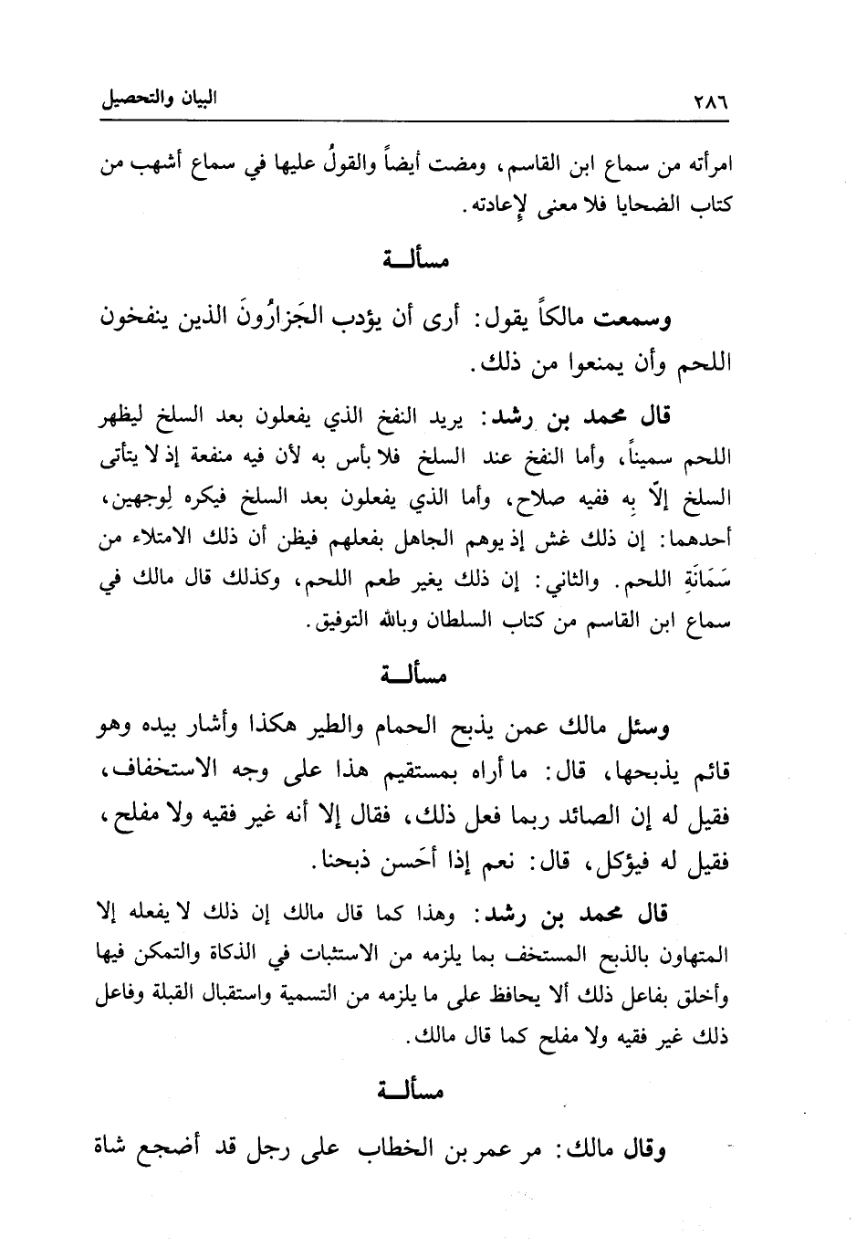قال محمد بن رشد: وهذا كما قال مالك إن ذلك لا يفعله إلا المتهاون بالذبح المستخف بما يلزمه من الاستثبات في الذكاة والتمكن فيها وأخلق بفاعل ذلك ألا يحافظ على ما يلزمه من التسمية واستقبال القبلة وفاعل ذلك غير فقيه ولا مفلح كما قال مالك.