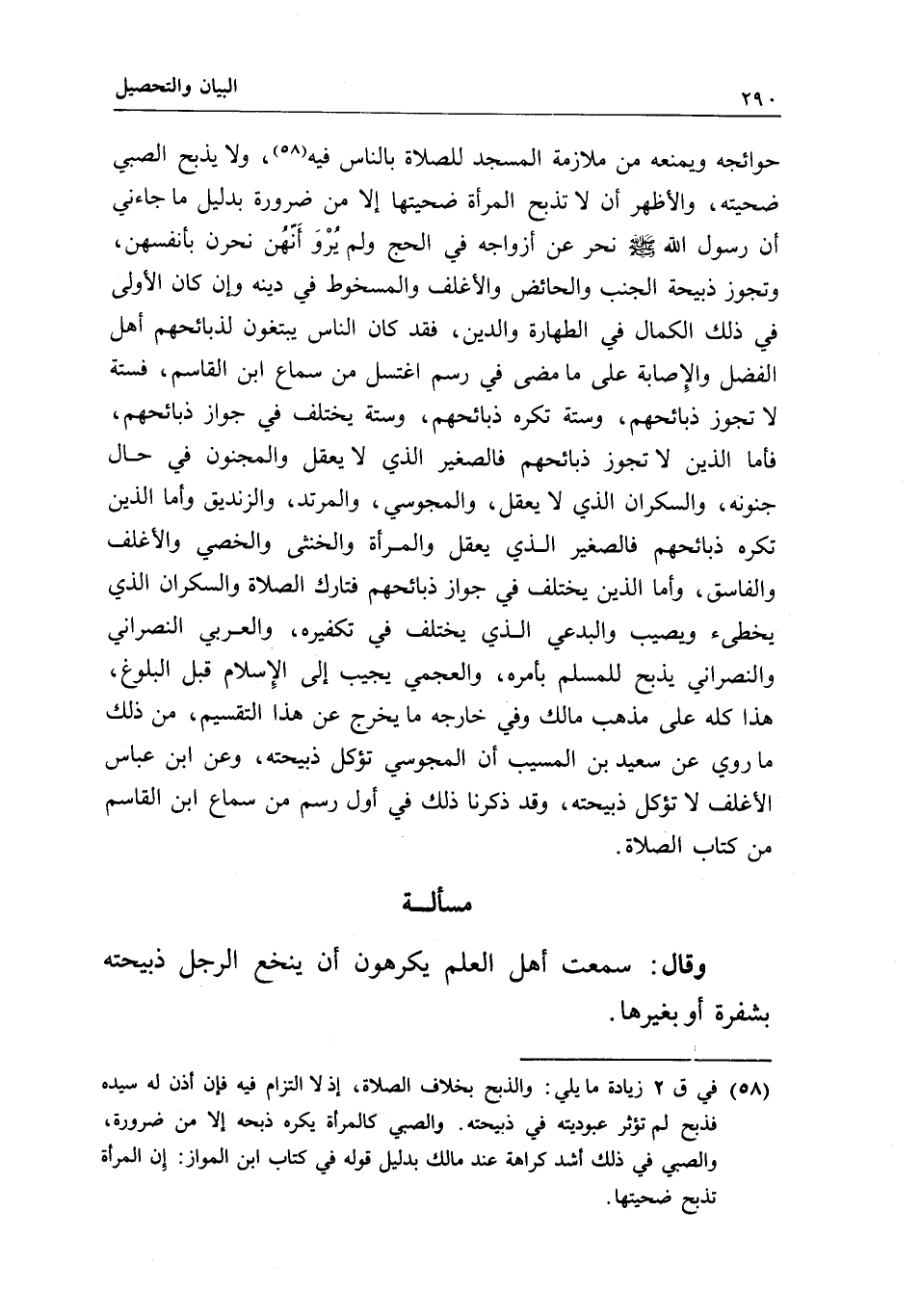 حوائجه ويمنعه من ملازمة المسجد للصلاة بالناس فيه، ولا يذبح الصبي ضحيته، والأظهر أن لا تذبح المرأة ضحيتها إلا من ضرورة بدليل ما جاءني أن رسول الله - صَلَّى اللَّهُ عَلَيْهِ وَسَلَّمَ - نحر عن أزواجه في الحج ولم يرو أنهن نحرن بأنفسهن، وتجوز ذبيحة الجنب والحائض والأغلف والمسخوط في دينه وإن كان الأولى في ذلك الكمال في الطهارة والدين، فقد كان الناس يبتغون لذبائحهم أهل الفضل والإصابة على ما مضى في رسم اغتسل من سماع ابن القاسم، فستة لا تجوز ذبائحهم، وستة تكره ذبائحهم، وستة يختلف في جواز ذبائحهم، فأما الذين لا تجوز ذبائحهم فالصغير الذي لا يعقل والمجنون في حال جنونه، والسكران الذي لا يعقل، والمجوسي، والمرتد، والزنديق وأما الذين تكره ذبائحهم فالصغير الذي يعقل والمرأة والخنثى والخصي والأغلف والفاسق، وأما الذين يختلف في جواز ذبائحهم فتارك الصلاة والسكران الذي يخطئ ويصيب والبدعي الذي يختلف في تكفيره، والعربي النصراني والنصراني يذبح للمسلم بأمره، والعجمي يجيب إلى الإسلام قبل البلوغ، هذا كله على مذهب مالك وفي خارجه ما يخرج عن هذا التقسيم، من ذلك ما روي عن سعيد بن المسيب أن المجوسي تؤكل ذبيحته، وعن ابن عباس الأغلف لا تؤكل ذبيحته، وقد ذكرنا ذلك في أول رسم من سماع ابن القاسم من كتاب الصلاة.