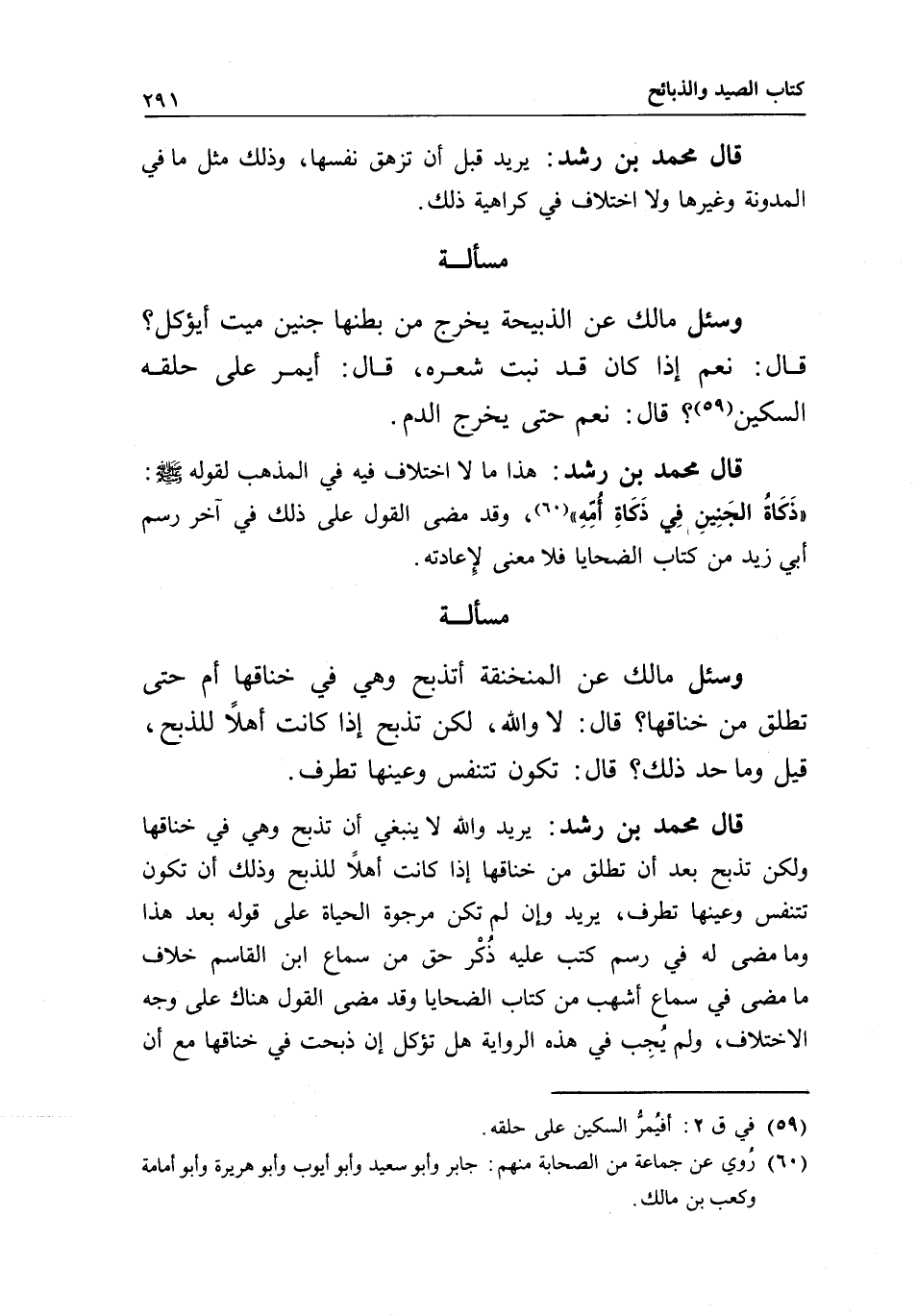 مسألة وسئل مالك عن المنخنقة أتذبح وهي في خناقها أم حتى تطلق من خناقها؟ قال: لا والله، لكن تذبح إذا كانت أهلا للذبح، قيل: وما حد ذلك؟ قال: تكون تتنفس وعينها تطرف.