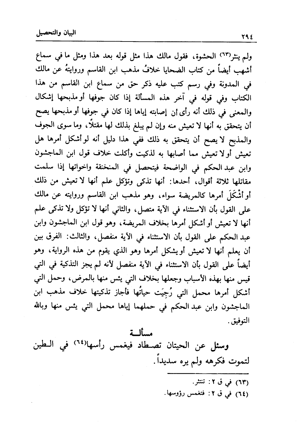 ولم ينثر الحشوة، فقول مالك هذا مثل قوله بعد هذا ومثل ما في سماع أشهب أيضا من كتاب الضحايا خلاف مذهب ابن القاسم وروايته عن مالك في المدونة وفي رسم كتب عليه ذكر حق من سماع ابن القاسم من هذا الكتاب، وفي قوله في آخر هذه المسألة إذا كان جوفها أو مذبحها إشكال، والمعنى في ذلك أنه رأى أن إصابته إياها إذا كان في جوفها أو مذبحها يصح أن يتحقق به أنها لا تعيش منه وإن لم يبلغ بذلك لها مقتلا، وما سوى الجوف والمذبح لا يصح أن يتحقق به ذلك؛ ففي هذا دليل أنه لو أشكل أمرها هل تعيش أو لا تعيش مما أصابها به لذكيت وأكلت خلاف قول ابن الماجشون وابن عبد الحكم في الواضحة؛ فيتحصل في المنخنقة وأخواتها إذا سلمت مقاتلها ثلاثة أقوال، أحدها: أنها تذكى وتؤكل علم أنها لا تعيش من ذلك أو أشكل أمرها كالمريضة سواء، وهو مذهب ابن القاسم وروايته عن مالك على القول بأن الاستثناء في الآية متصل، والثاني: أنها لا تؤكل ولا تذكى علم أنها لا تعيش أو أشكل أمرها بخلاف المريضة، وهو قول ابن الماجشون وابن عبد الحكم على القول بأن الاستثناء في الآية منفصل، والثالث: الفرق بين أن يعلم أنها لا تعيش أو يشكل أمرها وهو الذي يقوم من هذه الرواية، وهو أيضا على القول بأن الاستثناء في الآية منفصل لأنه لم يجز التذكية في التي قيس منها بهذه الأسباب وجعلها بخلاف التي يئس منها بالمرض، وحمل التي أشكل أمرها محمل التي رجيت حياتها فأجاز تذكيتها خلاف مذهب ابن الماجشون وابن عبد الحكم في حملهما إياها محمل التي يئس منها وبالله التوفيق.