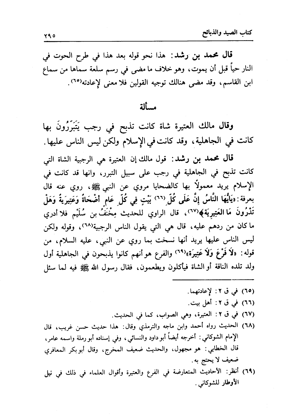 قال محمد بن رشد: قول مالك إن العتيرة هي الرجبية الشاة التي كانت تذبح في الجاهلية في رجب على سبيل التبرر، وإنها قد كانت في الإسلام يريد معمولا بها كالضحايا مروي عن النبي- صَلَّى اللَّهُ عَلَيْهِ وَسَلَّمَ -، روي عنه قال بعرفة: «يا أيها الناس إن على كل بيت في كل عام أضحاة وعتيرية، وهل تدرون ما العتيرية؟ "، قال الراوي للحديث مخنف بن سليم: فلا أدري ما كان من ردهم عليه، قال: هي التي يقول الناس الرجبية» ، وقوله: ولكن ليس الناس عليها يريد أنها نسخت بما روي عن النبي، - عَلَيْهِ السَّلَامُ -، من قوله: «لا فرع ولا عتيرة» والفرع هو أنهم كانوا يذبحون في الجاهلية أول ولد تلده الناقة أو الشاة فيأكلون ويطعمون، فقال رسول الله - صَلَّى اللَّهُ عَلَيْهِ وَسَلَّمَ - فيه لما سئل