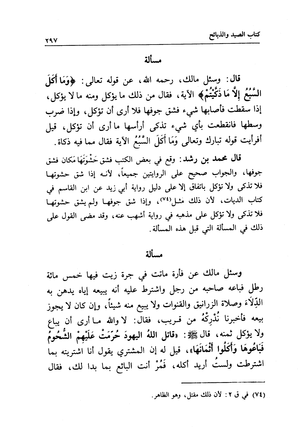 مسألة قال: وسئل مالك، - رَحِمَهُ اللَّهُ -، عن قَوْله تَعَالَى: {وَمَا أَكَلَ السَّبُعُ إِلا مَا ذَكَّيْتُمْ} [المائدة: 3] الآية، فقال: من ذلك ما يؤكل ومنه ما لا يؤكل، إذا سقطت فأصابها شيء فشق جوفها فلا أرى أن تؤكل، وإذا ضرب وسطها فانقطعت بأي شيء تذكى أرأسها ما أرى أن تؤكل، قيل: أفرأيت قوله تبارك وتعالى {وَمَا أَكَلَ السَّبُعُ} [المائدة: 3] الآية فقال: مما فيه ذكاة.