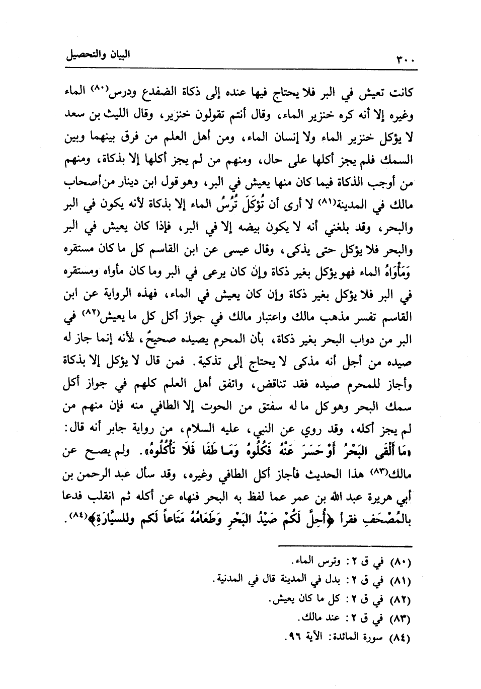 وقال عيسى عن ابن القاسم: كل ما كان مستقره ومأواه الماء فهو يؤكل بغير ذكاة وإن كان يرعى في البر وما كان مأواه ومستقره في البر فلا يؤكل بغير ذكاة وإن كان يعيش في الماء، فهذه الرواية عن ابن القاسم تفسر مذهب مالك واعتبار مالك في جواز أكل كل ما يعيش في البر من دواب البحر بغير ذكاة، بأن المحرم يصيده صحيح؛ لأنه إنما جاز له صيده من أجل أنه مذكى لا يحتاج إلى تذكية. فمن قال: لا يؤكل إلا بذكاة وأجاز للمحرم صيده فقد تناقض، واتفق أهل العلم كلهم في جواز أكل سمك البحر، وهو كل ما له سفتق من الحوت إلا الطافي منه فإن منهم من لم يجز أكله، وقد روي عن النبي، - عَلَيْهِ السَّلَامُ -، من رواية جابر أنه قال: «ما ألقى البحر أو حسر عنه فكلوه وما طفا فلا تأكلوه» . ولم يصح عن مالك هذا الحديث فأجاز أكل الطافي وغيره، وقد سأل عبد الرحمن بن أبي هريرة عبد الله بن عمر عما لفظ به البحر فنهاه عن أكله ثم انقلب فدعا بالمصحف فقرأ: {أُحِلَّ لَكُمْ صَيْدُ الْبَحْرِ وَطَعَامُهُ مَتَاعًا لَكُمْ وَلِلسَّيَّارَةِ} [المائدة: 96] .