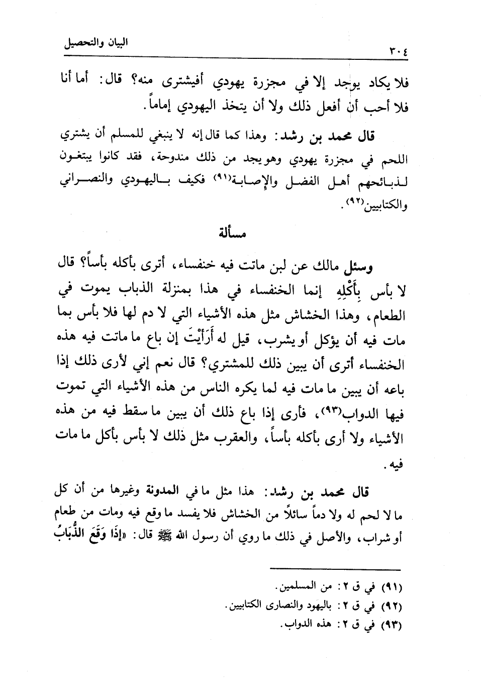 قال محمد بن رشد: وهذا كما قال إنه لا ينبغي للمسلم أن يشتري اللحم في مجزرة يهودي وهو يجد من ذلك مندوحة، فقد كانوا يبتغون لذبائحهم أهل الفضل والإصابة فكيف باليهودي والنصراني والكتابيين.