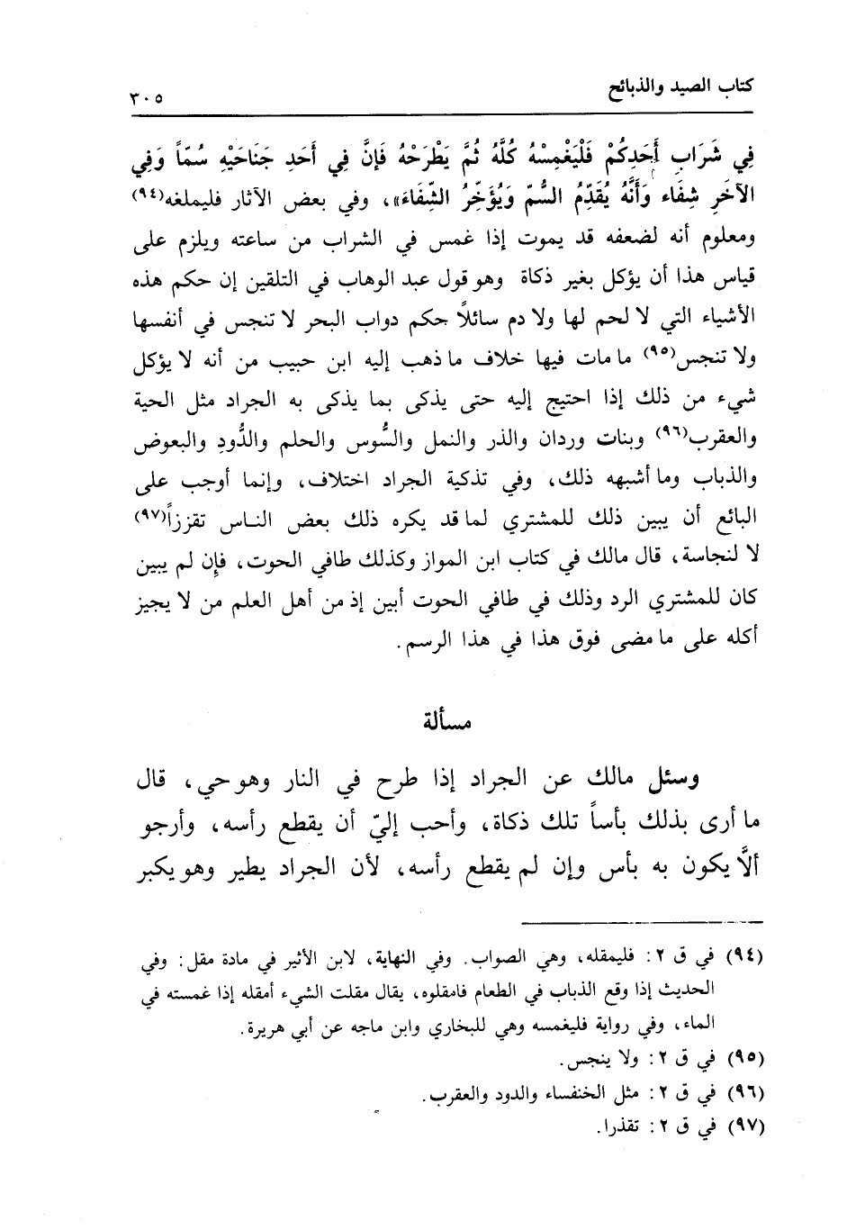 في شراب أحدكم فليغمسه كله ثم يطرحه فإن في أحد جناحيه سما وفي الآخر شفاء وأنه يقدم السم ويؤخر الشفاء» وفي بعض الآثار فليملغه ومعلوم أنه لضعفه قد يموت إذا غمس في الشراب من ساعته ويلزم على قياس هذا أن يؤكل بغير ذكاة، وهو قول عبد الوهاب في التلقين إن حكم هذه الأشياء التي لا لحم لها ولا دم سائلا حكم دواب البحر لا تنجس في أنفسها ولا تنجس ما مات فيها خلاف ما ذهب إليه ابن حبيب من أنه لا يؤكل شيء من ذلك إذا احتيج إليه حتى يذكى بما يذكى به الجراد مثل الحية والعقرب وبنات وردان والذر والنمل والسوس والحلم والدود والبعوض والذباب وما أشبهه ذلك، وفي تذكية الجراد اختلاف، وإنما أوجب على البائع أن يبين ذلك للمشتري لما قد يكره ذلك بعض الناس تقززا لا لنجاسة، قال مالك في كتاب ابن المواز: وكذلك طافي الحوت، فإن لم يبين كان للمشتري الرد وذلك في طافي الحوت أبين إذ من أهل العلم من لا يجيز أكله على ما مضى فوق هذا في هذا الرسم.