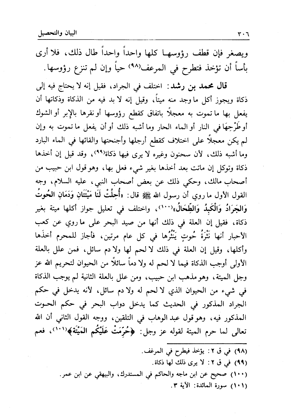 قال محمد بن رشد: اختلف في الجراد، فقيل: إنه لا يحتاج فيه إلى ذكاة ويجوز أكل ما وجد منه ميتا، وقيل: إنه لا بد فيه من الذكاة وذكاتها أن يفعل بها ما تموت به معجلا باتفاق كقطع رؤوسها أو نقرها بالإبر أو الشوك أو طرحها في النار أو الماء الحار وما أشبه ذلك، أو أن يفعل ما تموت به وإن لم يكن معجلا على اختلاف كقطع أرجلها وأجنحتها وإلقائها في الماء البارد وما أشبه ذلك؛ لأن سحنون وغيره لا يرى فيها ذكاة، وقد قيل: إن أخذها ذكاة وتوكل إن ماتت بعد أخذها بغير شيء فعل بها، وهو قول ابن حبيب من أصحاب مالك، وحكي ذلك عن بعض أصحاب النبي، - عَلَيْهِ السَّلَامُ -، وجه القول الأول ما روي أن رسول الله - صَلَّى اللَّهُ عَلَيْهِ وَسَلَّمَ - قال: «أحلت لنا ميتتان ودمان الحوت والجراد والكبد والطحال» ، واختلف في تعليل جواز أكلها ميتة بغير ذكاة، فقيل: إن العلة في ذلك أنها من صيد البحر على ما روي عن كعب الأحبار أنها نثرة حوت ينثرها في كل عام مرتين، فأجاز للمحرم أخذها وأكلها، وقيل: إن العلة في ذلك لا لحم لها ولا دم سائل، فمن علل بالعلة الأولى أوجب الذكاة فيما لا لحم له ولا دما سائلا من الحيوان لتحريم الله عز وجل الميتة، وهو مذهب ابن حبيب، ومن علل بالعلة الثانية لم يوجب الذكاة في شيء من الحيوان الذي لا لحم له ولا دم سائل؛ لأنه يدخل في حكم الجراد المذكور في الحديث كما يدخل دواب البحر في حكم الحوت المذكور فيه، وهو قول عبد الوهاب في التلقين، ووجه القول الثاني: أن الله تعالى لما حرم الميتة لقوله عز وجل: {حُرِّمَتْ عَلَيْكُمُ الْمَيْتَةُ} [المائدة: 3] فعم