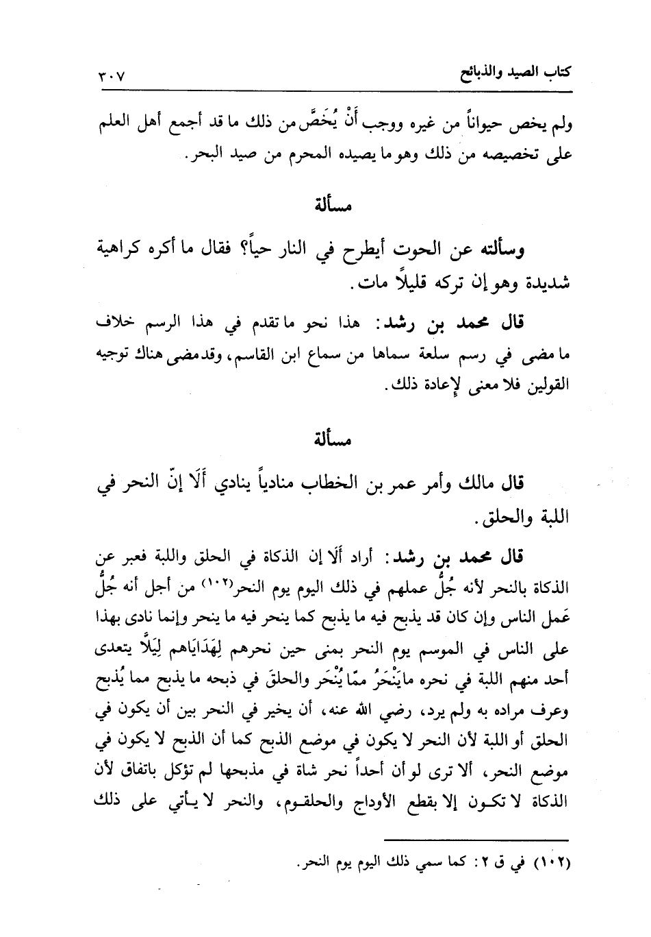 قال محمد بن رشد: أراد ألا إن الذكاة في الحلق واللبة فعبر عن الذكاة بالنحر؛ لأنه جل عملهم في ذلك اليوم يوم النحر من أجل أنه جل عمل الناس، وإن كان قد يذبح فيه ما يذبح كما ينحر فيه ما ينحر، وإنما نادى بهذا على الناس في الموسم يوم النحر بمنى حين نحرهم لهداياهم لئلا يتعدى أحد منهم اللبة في نحره ما ينحر مما ينحر والحلق في ذبحه ما يذبح مما يذبح وعرف مراده به ولم يرد، - رَضِيَ اللَّهُ عَنْهُ -، أن يخير في النحر بين أن يكون في الحلق أو اللبة؛ لأن النحر لا يكون في موضع الذبح كما أن الذبح لا يكون في موضع النحر، ألا ترى لو أن أحدا نحر شاة في مذبحها لم تؤكل باتفاق؛ لأن الذكاة لا تكون إلا بقطع الأوداج والحلقوم، والنحر لا يأتي على ذلك