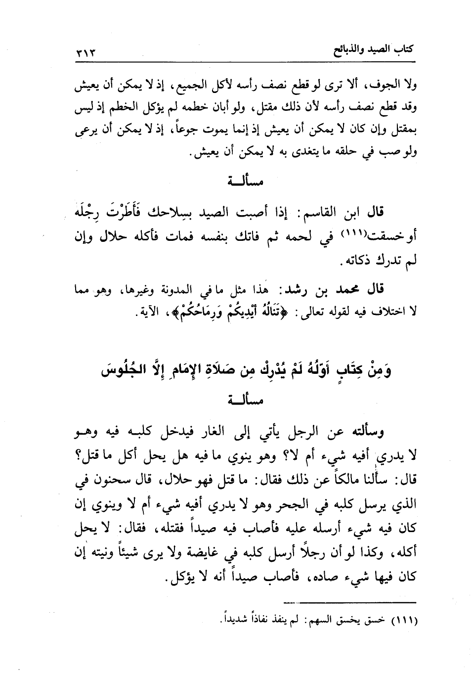 مسألة قال ابن القاسم: إذا أصبت الصيد بسلاحك فأطرت رجله أو خسقت في لحمه، ثم فاتك بنفسه فمات فأكله حلال، وإن لم تدرك ذكاته.