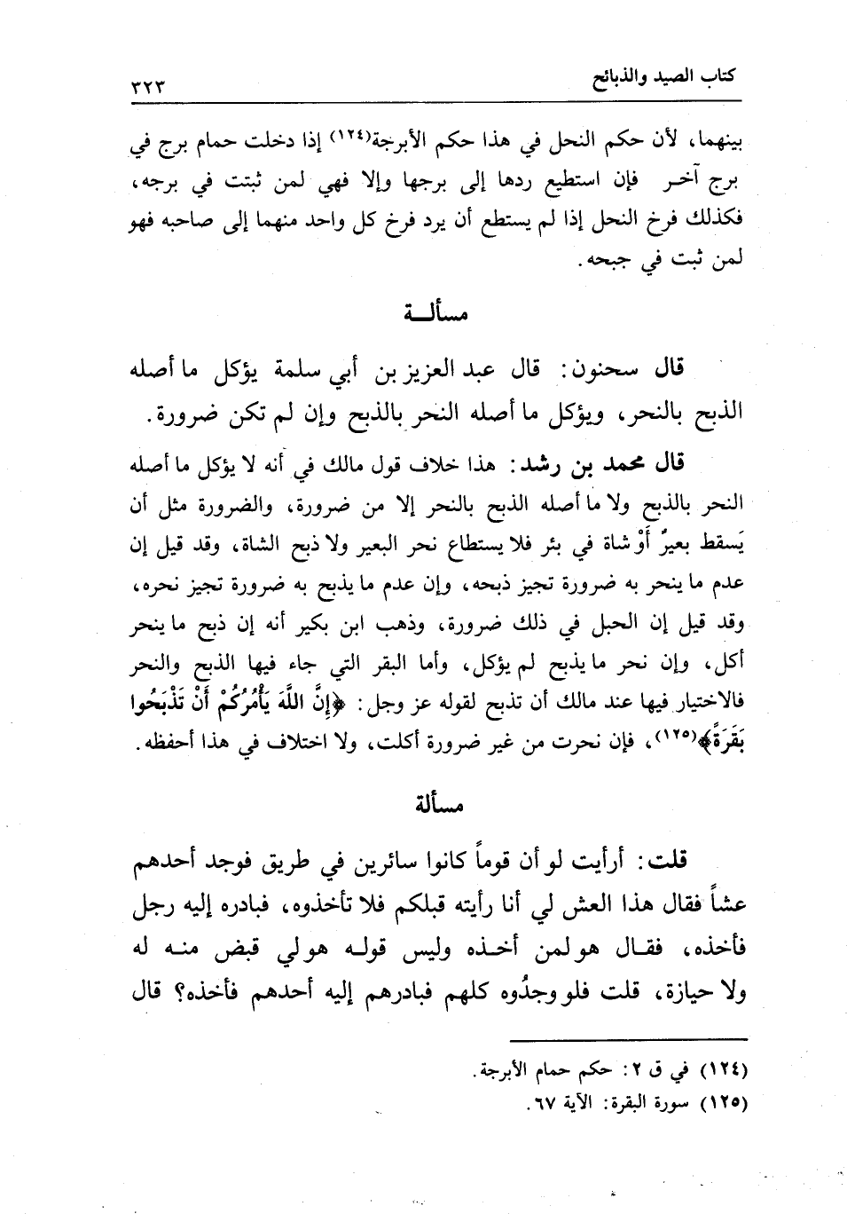 مسألة قال سحنون: قال عبد العزيز بن أبي سلمة: يؤكل ما أصله الذبح بالنحر، ويؤكل ما أصله النحر بالذبح، وإن لم تكن ضرورة.
