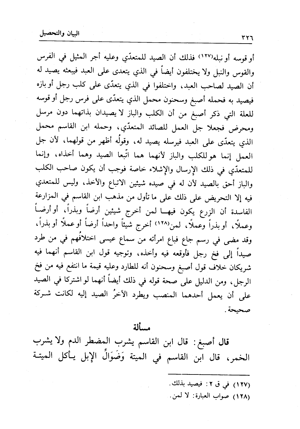 أو قوسه أو نبله فذلك أن الصيد للمتعدي وعليه أجر المثيل في الفرس والقوس والنبل، ولا يختلفون أيضا في الذي يتعدى على العبد، فيبعثه يصيد له أن الصيد لصاحب العبد، واختلفوا في الذي يتعدى على كلب رجل أو بازه فيصيد به فحمله أصبغ وسحنون محمل الذي يتعدى على فرس رجل أو قوسه للعلة التي ذكر أصبغ من أن الكلب والباز لا يصيدان بذاتهما دون مرسل ومحرض فجعلا جل العمل للصائد المتعدي، وحمله ابن القاسم محمل الذي يتعدى على العبد فيرسله يصيد له، وقوله أظهر من قولهما؛ لأن جل العمل إنما هو للكلب والباز؛ لأنهما هما اتبعا الصيد وهما أخذاه، وإنما للمتعدي في ذلك الإرسال والإشلاء خاصة، فوجب أن يكون صاحب الكلب والباز أحق بالصيد؛ لأن له في صيده شيئين الإتباع والأخذ، وليس للمتعدي فيه إلا التحريض على ذلك على ما تأول من مذهب ابن القاسم في المزارعة الفاسدة أن الزرع يكون فيها لمن أخرج شيئين أرضا وبذرا، أو أرضا وعملا، أو بذرا وعملا، لمن أخرج شيئا واحدا أرضا أو عملا أو بذرا، وقد مضى في رسم جاع فباع امرأته من سماع عيسى اختلافهم في من طرد صيدا إلى فخ رجل فأوقعه فيه وأخذه، وتوجيه قول ابن القاسم: أنهما فيه شريكان خلاف قول أصبغ وسحنون: أنه للطارد وعليه قيمة ما انتفع فيه من فخ الرجل، ومن الدليل على صحة قوله في ذلك أيضا أنهما لو اشتركا في الصيد على أن يعمل أحدهما المنصب ويطرد الآخر الصيد إليه لكانت شركة صحيحة.
