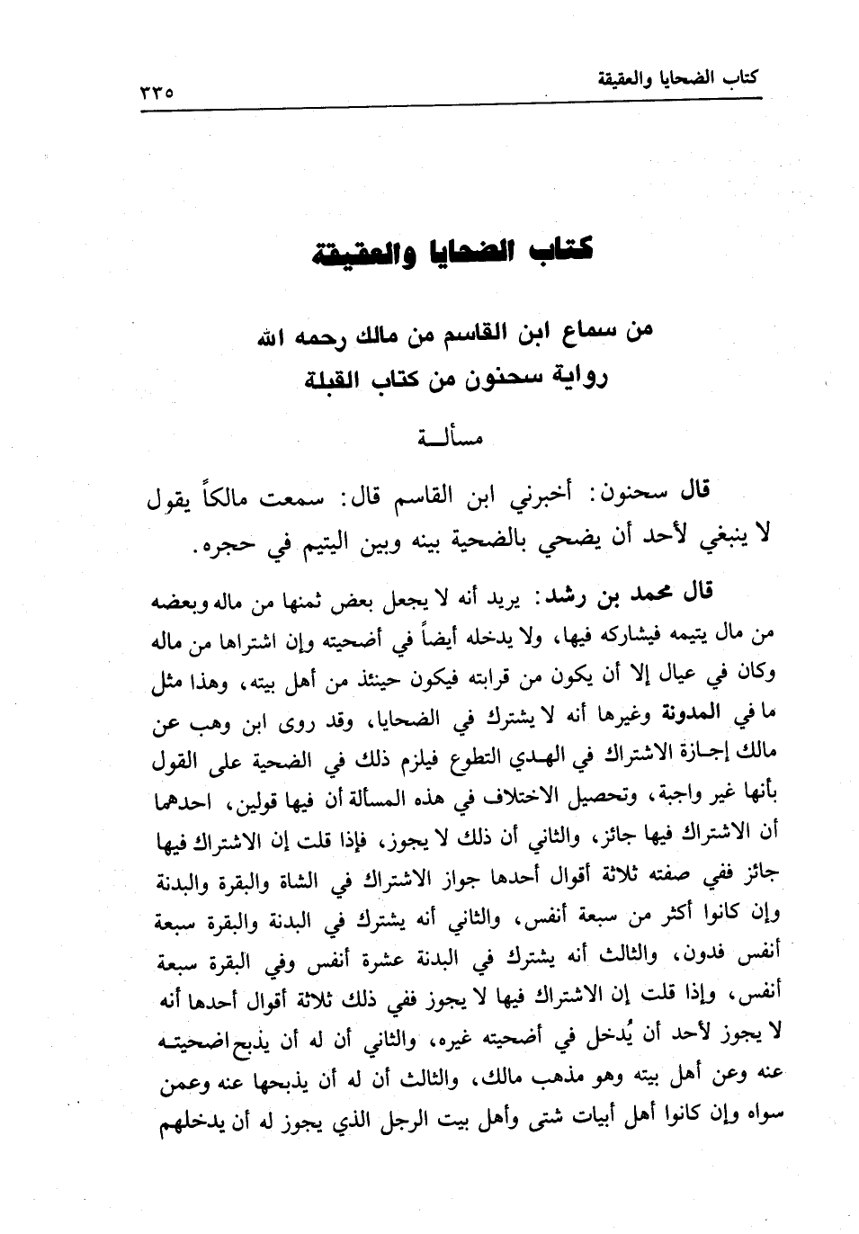 من سماع ابن القاسم من مالك - رَحِمَهُ اللَّهُ - رواية سحنون من كتاب القبلة مسألة قال سحنون: أخبرني ابن القاسم قال: سمعت مالكا يقول: لا ينبغي لأحد أن يضحي بالضحية بينه وبين اليتيم في حجره.