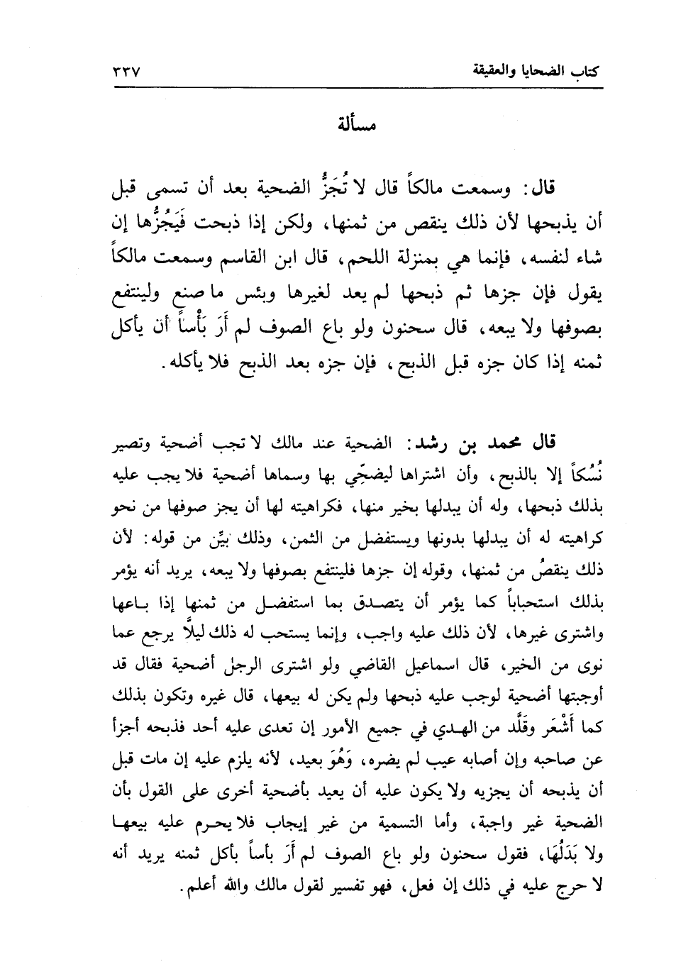 قال محمد بن رشد: الضحية عند مالك لا تجب أضحية وتصير نسكا إلا بالذبح، وإن اشتراها ليضحي بها وسماها أضحية، فلا يجب عليه بذلك ذبحها، وله أن يبدلها بخير منها، فكراهيته لها أن يجز صوفها من نحو كراهيته له أن يبدلها بدونها، ويستفضل من الثمن، وذلك بين من قوله: لأن ذلك ينقص من ثمنها، وقوله: إن جزها فلينتفع بصوفها ولا يبعه، يريد أنه يؤمر بذلك استحبابا كما يؤمر أن يتصدق بما استفضل من ثمنها إذا باعها واشترى غيرها؛ لأن ذلك عليه واجب، وإنما يستحب له ذلك لئلا يرجع عما نوى من الخير، قال إسماعيل القاضي: ولو اشترى الرجل أضحية، فقال: قد أوجبتها أضحية لوجب عليه ذبحها ولم يكن له بيعها، قال غيره: وتكون بذلك كما أشعر وقلد من الهدي في جميع الأمور إن تعدى عليه أحد فذبحه أجزأ عن صاحبه، وإن أصابه عيب لم يضره، وهو بعيد؛ لأنه يلزم عليه إن مات قبل أن يذبحه أن يجزيه ولا يكون عليه أن يعيد بأضحية أخرى على القول: بأن الضحية غير واجبة، وأما التسمية من غير إيجاب فلا يحرم عليه بيعها ولا بدلها، فقول سحنون: ولو باع الصوف لم أر بأسا بأكل ثمنه يريد أنه لا حرج عليه في ذلك إن فعل، فهو تفسير لقول مالك والله أعلم.
