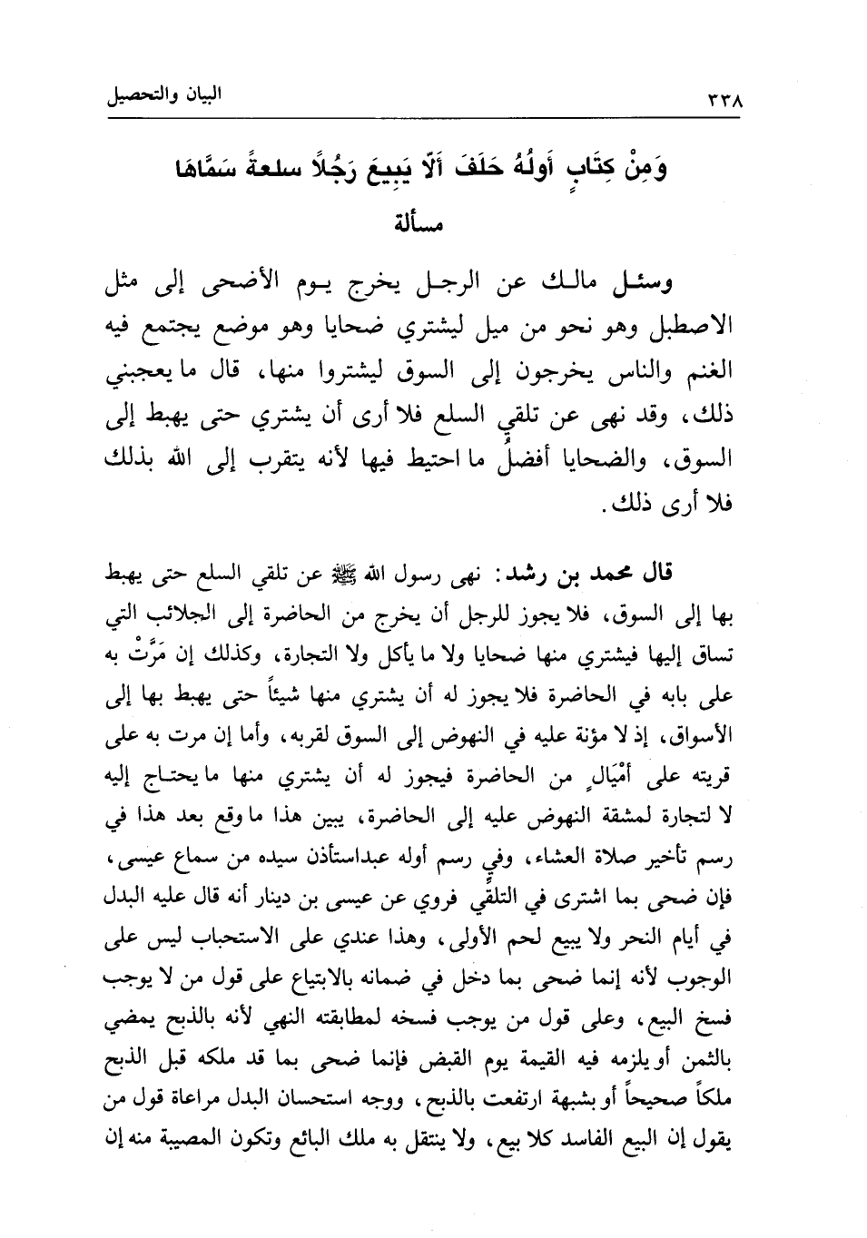 قال محمد بن رشد: «نهى رسول الله - صَلَّى اللَّهُ عَلَيْهِ وَسَلَّمَ - عن تلقي السلع حتى يهبط بها إلى السوق» ، فلا يجوز للرجل أن يخرج من الحاضرة إلى الجلائب التي تساق إليها، فيشتري منها ضحايا ولا ما يأكل ولا التجارة، وكذلك إن مرت به على بابه في الحاضرة، فلا يجوز له أن يشتري منها شيئا حتى يهبط بها إلى الأسواق، إذ لا مؤنة عليه في النهوض إلى السوق لقربه، وأما إن مرت به على قريته على أميال من الحاضرة، فيجوز له أن يشتري منها ما يحتاج إليه لا لتجارة لمشقة النهوض عليه إلى الحاضرة، يبين هذا ما وقع بعد هذا في رسم تأخير صلاة العشاء، وفي رسم أوله عبد استأذن سيده من سماع عيسى، فإن ضحى بما اشترى في التلقي فروي عن عيسى بن دينار أنه قال: عليه البدل في أيام النحر ولا يبيع لحم الأولى، وهذا عندي على الاستحباب ليس على الوجوب؛ لأنه إنما ضحى بما دخل في ضمانه بالابتياع على قول من لا يوجب فسخ البيع، وعلى قول من يوجب فسخه لمطابقته النهي؛ لأنه بالذبح يمضي بالثمن أو يلزمه فيه القيمة يوم القبض، فإنما ضحى بما قد ملكه قبل الذبح ملكا صحيحا أو بشبهة ارتفعت بالذبح، ووجه استحسان البدل مراعاة قول من يقول: إن البيع الفاسد كلا بيع، ولا ينتقل به ملك البائع وتكون المصيبة منه إن