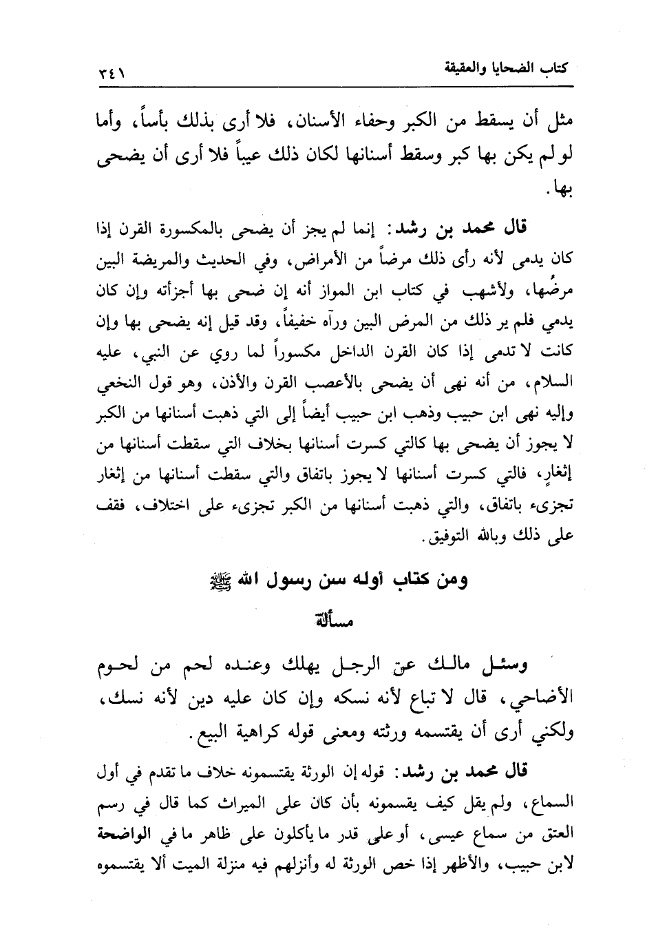 قال محمد بن رشد: إنما لم يجز أن يضحى بالمكسورة القرن إذا كان يدمى؛ لأنه رأى ذلك مرضا من الأمراض، وفي الحديث والمريضة البين مرضها، ولأشهب في كتاب ابن المواز أنه إن ضحى بها أجزأته، وإن كان يدمي فلم ير ذلك من المرض البين ورآه خفيفا، وقد قيل: إنه يضحى بها، وإن كانت لا تدمى إذا كان القرن الداخل مكسورا لما روي عن النبي، - عَلَيْهِ السَّلَامُ -، من أنه «نهى أن يضحى بالأعصب القرن والأذن» ، وهو قول النخعي وإليه نهى ابن حبيب، وذهب ابن حبيب أيضا إلى التي ذهبت أسنانها من الكبر لا يجوز أن يضحى بها كالتي كسرت أسنانها بخلاف التي سقطت أسنانها من إثغار، فالتي كسرت أسنانها لا يجوز باتفاق، والتي سقطت أسنانها من إثغار تجزئ باتفاق، والتي ذهبت أسنانها من الكبر تجزئ على اختلاف، فقف على ذلك وبالله التوفيق.