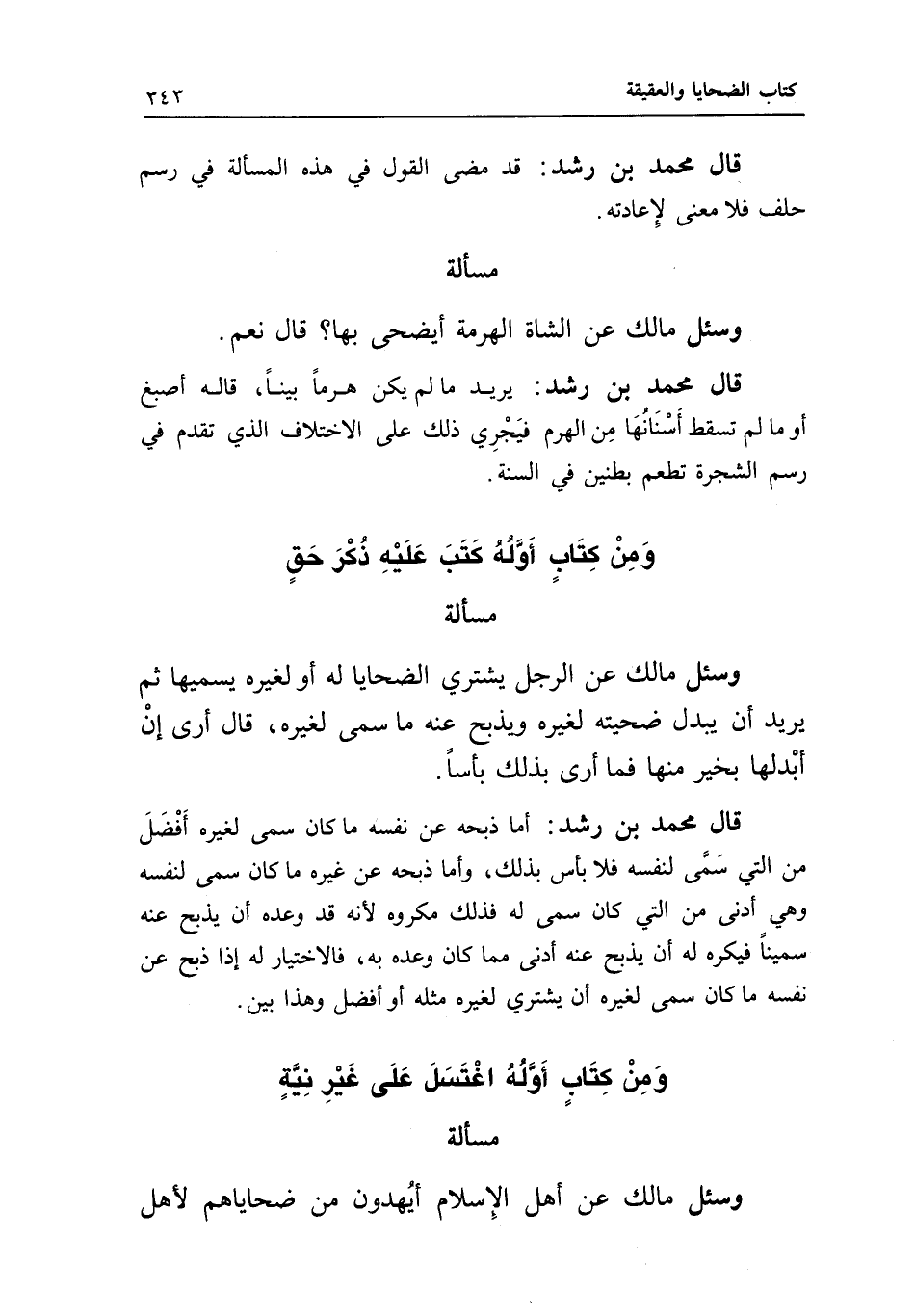 ومن كتاب أوله اغتسل على غير نية مسألة وسئل مالك: عن أهل الإسلام أيهدون من ضحاياهم لأهل