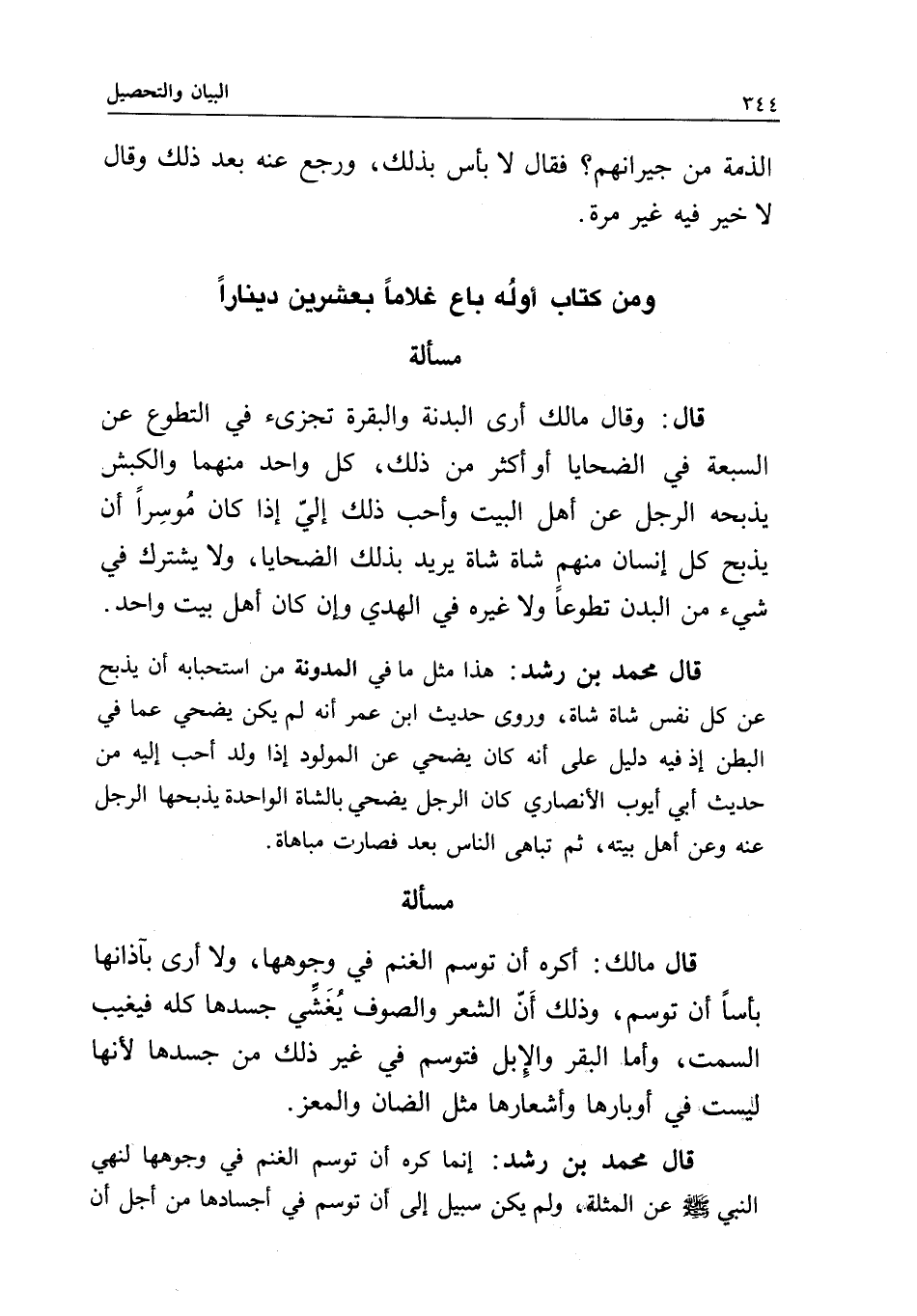 قال محمد بن رشد: هذا مثل ما في المدونة من استحبابه أن يذبح عن كل نفس شاة شاة، وروى حديث ابن عمر أنه لم يكن يضحي عما في البطن إذ فيه دليل على أنه كان يضحي عن المولود إذا ولد أحب إليه من حديث أبي أيوب الأنصاري «كان الرجل يضحي بالشاة الواحدة يذبحها الرجل عنه وعن أهل بيته، ثم تباهى الناس بعد فصارت مباهاة» .