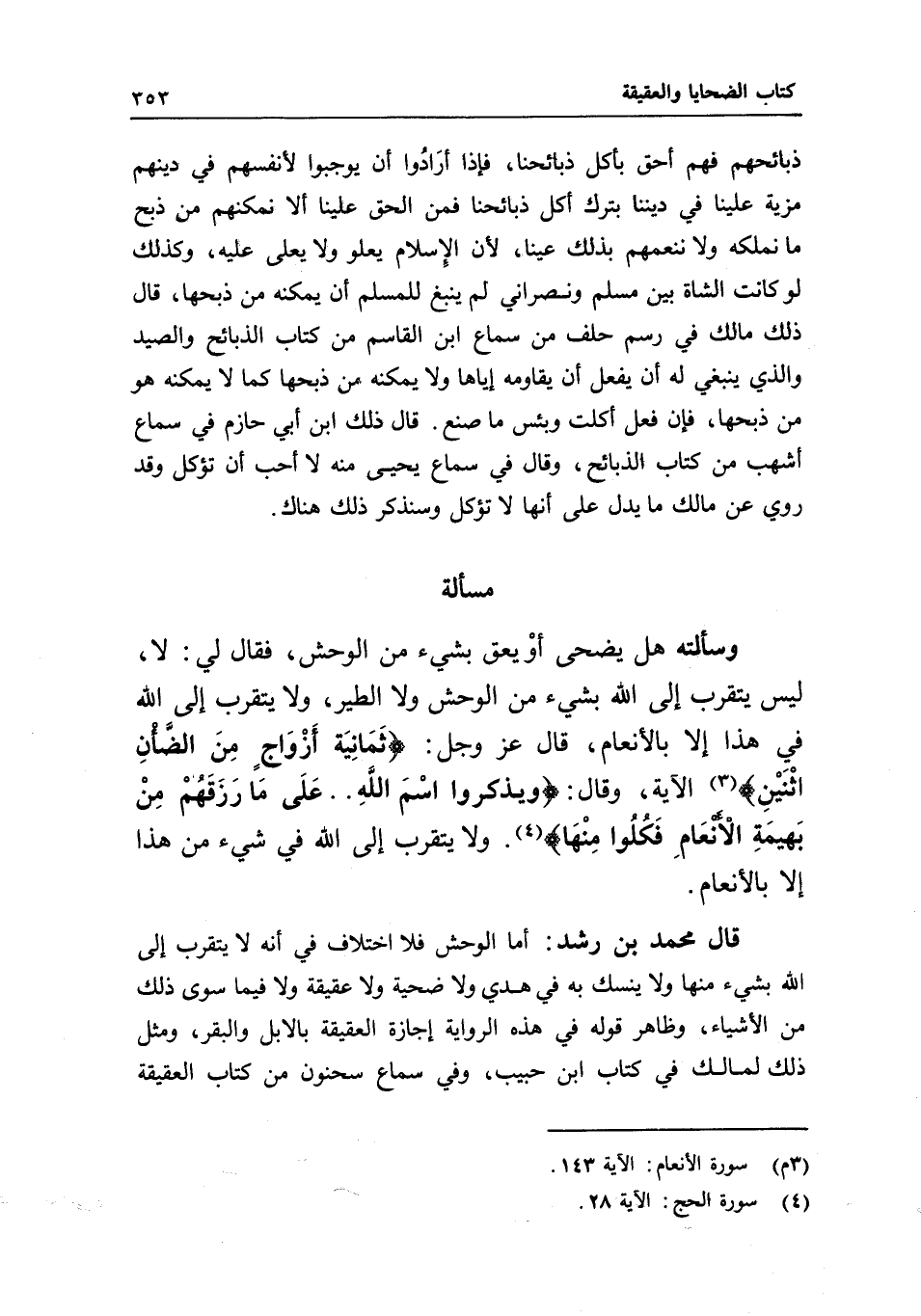 مسألة وسألته هل يضحى أو يعق بشيء من الوحش، فقال لي: لا، ليس يتقرب إلى الله بشيء من الوحش ولا الطير، ولا يتقرب إلى الله في هذا إلا بالأنعام، قال عز وجل: {ثَمَانِيَةَ أَزْوَاجٍ مِنَ الضَّأْنِ اثْنَيْنِ} [الأنعام: 143] الآية، وقال: {وَيَذْكُرُوا اسْمَ اللَّهِ} [الحج: 28] . . {عَلَى مَا رَزَقَهُمْ مِنْ بَهِيمَةِ الأَنْعَامِ فَكُلُوا مِنْهَا} [الحج: 28] . ولا يتقرب إلى الله في شيء من هذا إلا بالأنعام.