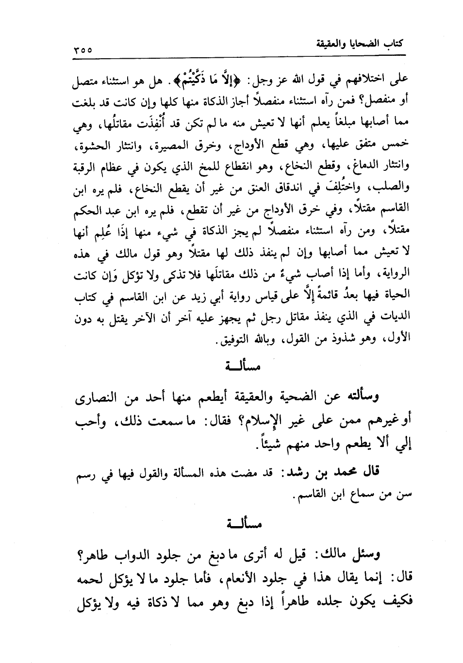 على اختلافهم في قول الله عز وجل: {إِلا مَا ذَكَّيْتُمْ} [المائدة: 3] . هل هو استثناء متصل أو منفصل؟ فمن رآه استثناء منفصلا أجاز الذكاة منها كلها، وإن كانت قد بلغت مما أصابها مبلغا يعلم أنها لا تعيش منه ما لم تكن قد أنفذت مقاتلها، وهي خمس متفق عليها، وهي قطع الأوداج، وخرق المصيرة، وانتثار الحشوة، وانتثار الدماغ، وقطع النخاع، وهو انقطاع للمخ الذي يكون في عظام الرقبة والصلب، واختلف في اندقاق العنق من غير أن يقطع النخاع، فلم يره ابن القاسم مقتلا، وفي خرق الأوداج من غير أن تقطع، فلم يره ابن عبد الحكم مقتلا، ومن رآه استثناء منفصلا لم يجز الذكاة في شيء منها إذا علم أنها لا تعيش مما أصابها، وإن لم ينفذ ذلك لها مقتلا وهو قول مالك في هذه الرواية، وأما إذا أصاب شيء من ذلك مقاتلها، فلا تذكى ولا تؤكل، وإن كانت الحياة فيها بعد قائمة إلا على قياس رواية أبي زيد عن ابن القاسم في كتاب الديات في الذي ينفذ مقاتل رجل، ثم يجهز عليه آخر أن الآخر يقتل به دون الأول، وهو شذوذ من القول، وبالله التوفيق.